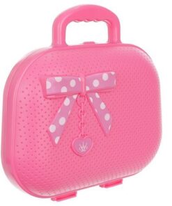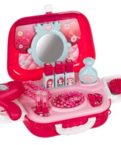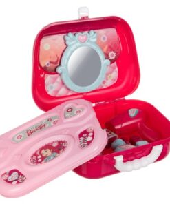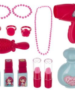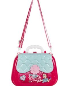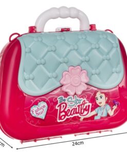Детски комплект за гримове с чантичка. Този уникален комплект за грим съдържа всичко, което ще бъде полезно за един малък стилист. В заключваща се кутия има имитации: 1 x сешоар, 1 x имитация на огледало, 3 x лак за нокти, 3 x пръстен, 2 x гривна, 1 x мъниста, 2 x червило, 1 x гребен, 1 x парфюм, 2 x странична стойка, 1 х капак, 1 х чанта, 1 х стикер, 1 х каишка. Комплектът е в затворена дамска чанта във формата на портмоне. След сгъване ще изглежда страхотно като чанта през рамо. Благодарение на това малката принцеса ще може да го вземе навсякъде, например на детска градина или при баба и дядо си. 2 в 1 – това е дамска чанта и преносима тоалетка в 1, която определено ще улесни изпълнението на всички видове стайлинг навсякъде. Комплектът изглежда детски и професионален в същото време. Благодарение на това детето ви ще може да играе ролята на малък стилист. Освен това комплектът е изработен с внимание към всички детайли, благодарение на което изглежда изключително стилно и професионално. Цялата козметика не е истинска и е изработена от нетоксични, екологично чисти материали.