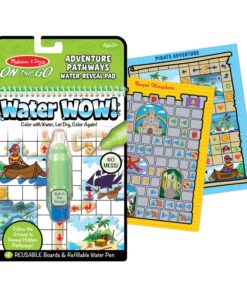 Детски комплект за рисуване с вода Приключенски пътеки Melissa & Doug. Тази вълнуваща книжка за оцветяване с боя и вода включва четири страници за многократна употреба и писалка с вода за многократно пълнене. Следвайте стрелките, за да разкриете скрити пътища, които водят до забавни приключения, и след това попълнете околните сцени! Детайлите и живите цветове се появяват с всеки щрих. След това оставете страницата да изсъхне, за да изтриете снимките и да я оцветявате отново и отново. Тази книга с приключенска тематика включва четири многопътечни лабиринта и сцени за оцветяване (космос, кралско кралство, джунгла, пирати) и дейности за търсене и намиране и броене за всяка сцена. Водната писалка с големи размери е лесна за държане от децата и се съхранява спретнато точно в предния капак, което прави този Water WOW! идеална книга за занимания за пътуване и играчка за пътуване за деца! Разгледайте още продукти в категорията “Книжки за оцветяване с вода ” – ТУК
