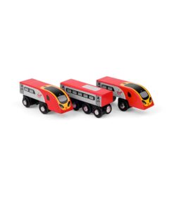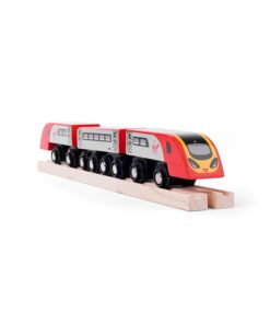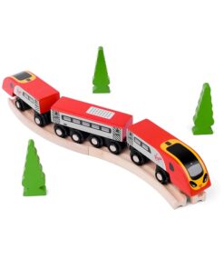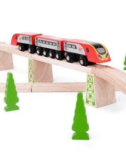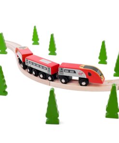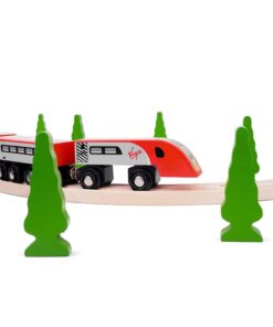 Детско дървено влакче с релси Пендолино Bigjigs. Един от най-разпознаваемите влакове в света, влаковете Pendolino, пристигат за първи път в Обединеното кралство през 2001 г., когато Virgin Trains купува 53 класа 390 Pendolino. Pendolinos са създадени през 60-те години на миналия век в Италия, като името произлиза от италианската дума pendolo, която се превежда като „малко махало“ – поради начина, по който влакът се накланя, когато заобикаля завои на коловоза. Механизмът за накланяне на влака Pendolino означава, че той може да се движи с по-високи скорости по по-стари релси, като същевременно поддържа комфорта на пътниците. Максималната скорост на Pendolino е 140 mph, но може да се движи само със 125 mph в Обединеното кралство. Bigjigs Rail Virgin Trains Pendolino се движи с по-скромна скорост, задвижван от малки ръчички по дървена железопътна мрежа! Това влакче-играчка Virgin Pendolino е идеалното допълнение към дървен влак и се доставя в комплект с два двигателя, вагон и две парчета дървена релса. Магнитните съединители осигуряват съвместимост с гамата Bigjigs Rail. Повечето други големи марки дървени железопътни линии са съвместими с Bigjigs Rail. Изработен от висококачествени материали с отговорни източници. Отговаря на настоящите европейски стандарти за безопасност. Състои се от 5 игрални фигури. Разгледайте още от категорията “Дървени влакчета” ТУК!
