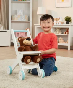 Дървена бебешка количка за кукли Melissa & Doug. Всеки момент е подходящ за любимите кукли и плюшени животни да се разходят в тази уютна и класически стилна подвижна дървена количка! Направена да пасва на кукли с височина до 20 инча, тази издръжлива бяла количка е висока приблизително 50 см и разполага с неплъзгащи се колела, облегалка от плат и платнено джобче за играчки и неща от първа необходимост в движение. Ясните инструкции улесняват сглобяването само с отвертка (не е включена). Куклите и аксесоарите Mine to Love насърчават съпричастността и помагат на децата да изразят себе си, докато изследват ролите и отговорностите на възрастните. Увереността и самочувствието на детето разцъфтяват и растат с всеки възпитаващ момент на игра с въображение! Разгледайте още от категорията “Дървени проходилки” ТУК!