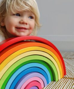 Дървена детска играчка Голяма Дъга Bigjigs. Възможностите за игра са безкрайни с тази многофункционална и здрава играчка за подреждане на голяма дъга. Без насоки или правила, това е брилянтна Монтесори играчка. С тези подреждащи се арки за игра, малките ръчички могат да сглобяват различни форми и предмети, докато научават всичко за различните размери и цветове. Изработена от масивна дървесина и оцветена с нетоксични бои. След като времето за игра приключи, този Rainbow Stacker е забавна украса за спалнята или детската стая на вашите малки. Развива креативността и сръчността. Изработен от висококачествени материали с отговорни източници. Отговаря на настоящите европейски стандарти за безопасност. Възраст 3+ години. Разгледайте още от категорията “Дървени низанки” ТУК!