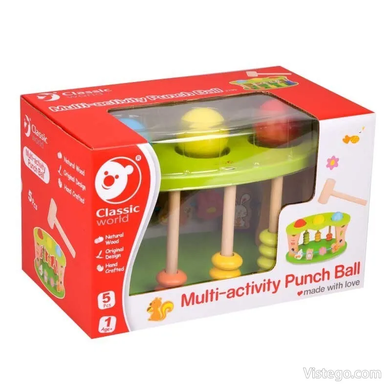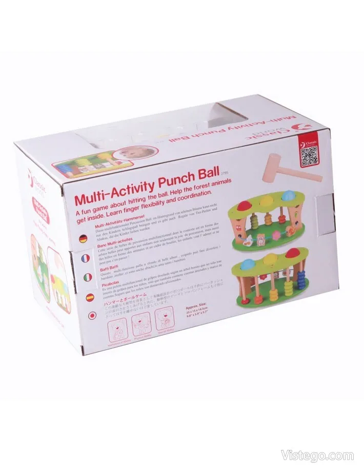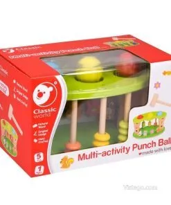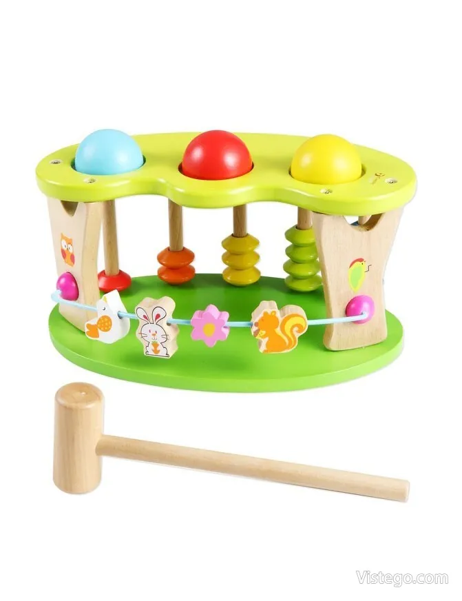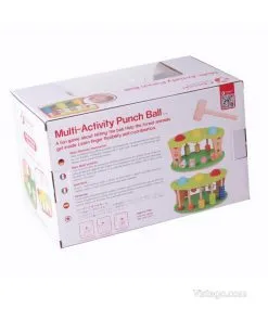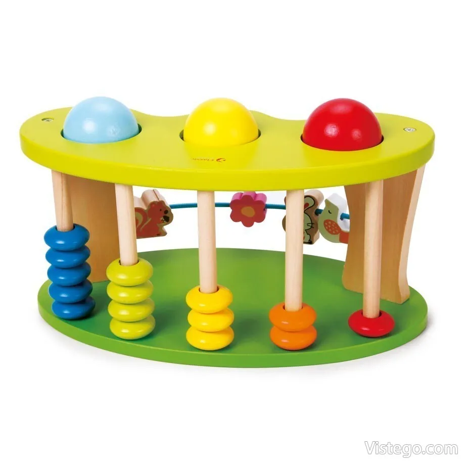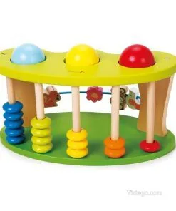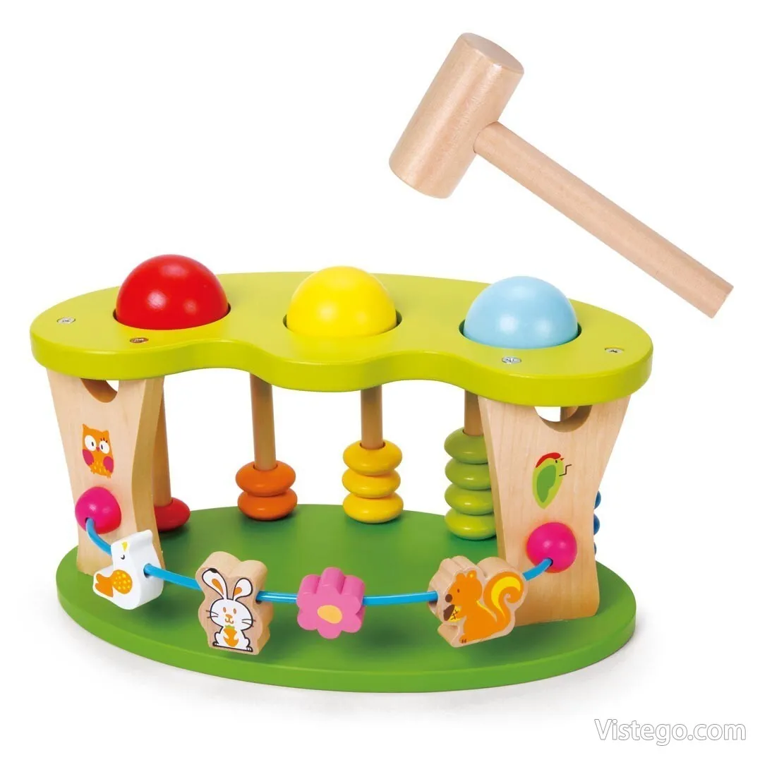 Детска играчка за координация с дървена конструкция, топчета, чукче, сметало и спирала с животни за прецизност и точност.