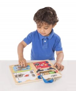 Дървена дъска за деца с ключалки Melissa & Doug. Вашите деца ще бъдат развълнувани и нетърпеливи да разберат, какво се крие зад заключените врати. Заниманието с нея ще помогне за развиването на фината моторика, координацията око-ръка и разбира се, работата с ключове и различни ключалки. Помага за научаването на основните цветове, числа, животни и още много забавни неща. Докато децата Ви прекарват часове в игри и забавления с образователна дървена дъска с ключалки, ще могат да се научат как да създават истории вдъхновени от картинките, които ще открият под вратите и ще се запознаят с различните начини на отключване и заключване. Към комплекта има включено ключe. Посочената цена е за 1 брой. Разгледайте още от категорията “Монтесори играчки” ТУК