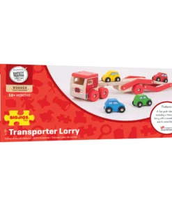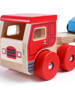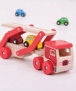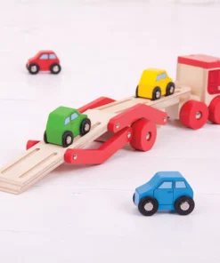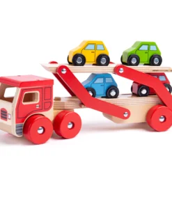 Дървена играчка за деца Транспортен камион . Тази дървена играчка камион транспортер помага за развитието на сръчността и координацията на децата, докато играят. Той носи товар от четири цветни дървени коли (които пасват добре върху ремаркето) и е безопасен за игра на малки ръчички. Горният етаж на камиона за коли-играчки може лесно да се спусне, за да позволи на всяко превозно средство да се качва и слиза, а жлебовете на повърхността помагат за задържането на всяка кола на място, докато се транспортира до местоназначението. Изработен е от висококачествени, отговорно произведени материали. Отговаря на настоящите европейски стандарти за безопасност. Подходящ за 12 месеца +. Разгледайте още от категорията “Дървени колички и камиони” ТУК
