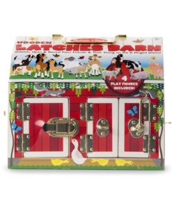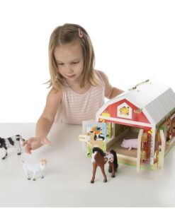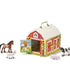 Дървена играчка Обор с животни.Дървеният обор на Melissa & Doug е чудесен подарък за всички малки любители на фермата. С удобна дръжка за пренасяне, като разполага с едно голямо помещение за четирите животни в комплекта – конче, кравичка, козичка и прасенце, които са изработени от пластмаса. Интересните ключалки ще занимават децата и ще развиват тяхната фина моторика и логическо мислене, а играта с обора ще стимулира въображението и ролевата игра. Висококачествените материали, от които е изработена играчката, обещават дълги години игра, а боите, с които е боядисана са напълно безвредни. Комплектът съдържа: обор и 4 пластмасови животни. Разгледайте още от категорията “Къщи за кукли и принадлежности” ТУК
