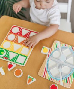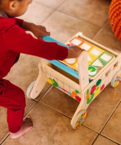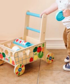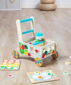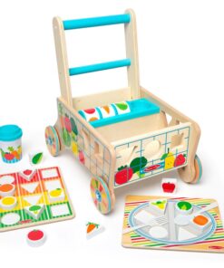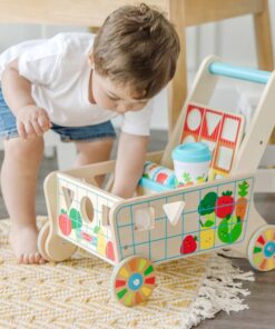Дървена количка за деца с хранителни продукти Melissa & Doug. Тази весела и здрава дървена количка за хранителни стоки е пълна със забавни дейности за изграждане на умения! Много малки деца могат да сортират цветни дървени форми за храна през дупки в страните на количката и да ги поставят в две дървени дъски за пъзел, които се съхраняват в количката. Завъртете вградения ролков барабан за сензорна стимулация и игри за съпоставяне и подобрете имитативната игра на преструвки с реалистична чаша за кафе с подвижен капак, която се побира в поставка за чаша в количката! Докато децата растат, използването на количката като играчка за бутане помага за изграждането на двигателни умения и вдъхновява въображаемата игра. Страхотен начин да насърчите децата на 12 месеца и повече да изследват решаването на проблеми и причината и следствието. Играчките за бебета и малки деца Melissa & Doug вдъхновяват „а-ха!“ моменти на откритие. Очарователни, разнообразни герои и разнообразие от забавни форми и текстури насърчават изследователската игра за изграждане на умения. Разгледайте още от категорията “Дървени проходилки” ТУК!