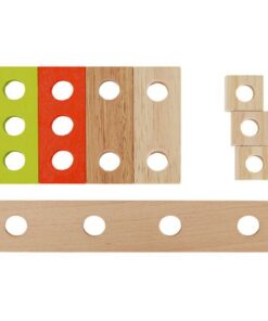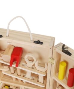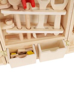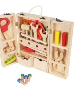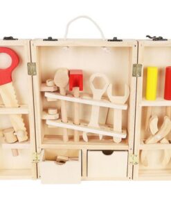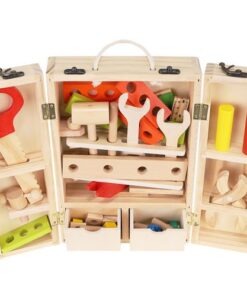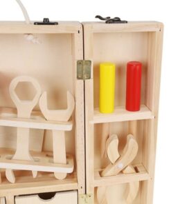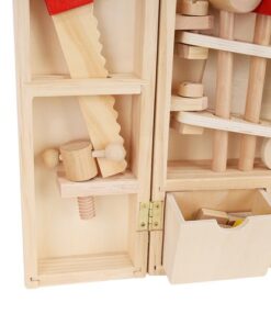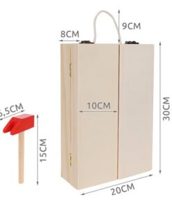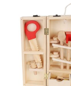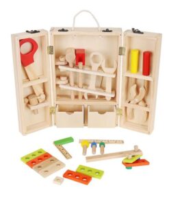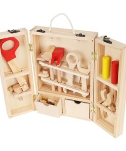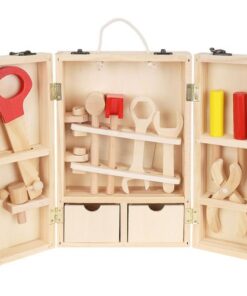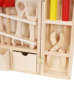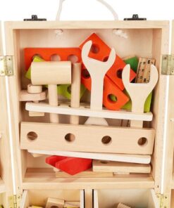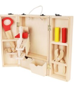 Дървена кутия с инструменти – детски сет. Комплектът включва кутия и аксесоари като: винтове, гайки, трион, чукове, дъски с отвори, отвертки, клещи, линийка и ъгъл. Кутията има и удобна дръжка от дебела връв. Вътре в кутията има множество отделения и места за поставяне на всички инструменти. Играчката е изработена от дърво и боядисана с боя, която е безопасна за здравето на детето. Дървените играчки са вечно предложение, което ще зарадва всяко малко дете. Класическата красота на дървото и неговата издръжливост винаги са го правили високо оценено. Тази суровина изглежда добре както в естествен цвят, така и в боядисана. Поради факта, че кутията и аксесоарите са изработени от дърво, те са безопасни за всяко дете. Естествената суровина означава, че дори детето да сложи играчката в устата си, то няма да има контакт с пластмасите. Комплектът има сертификати CE и EN 71. Сетът е идеален за образователни цели, докато се забавлявате. Учи децата на креативност, логическо мислене и помага за развитието на ръчни умения и фини двигателни умения. От елементите, включени в комплекта, малкото дете може да създава прости конструкции.