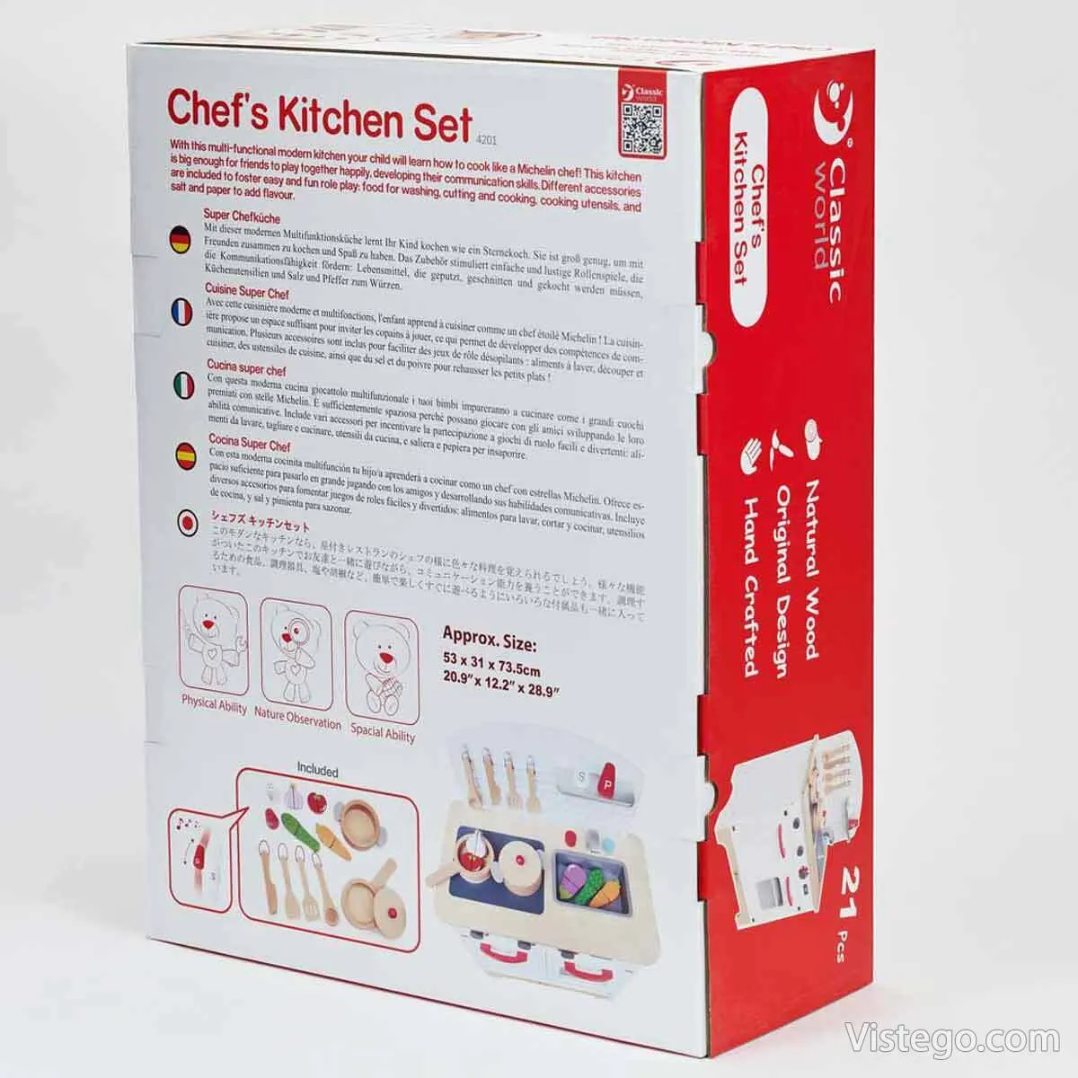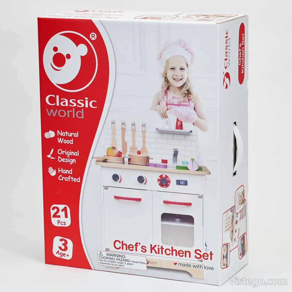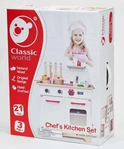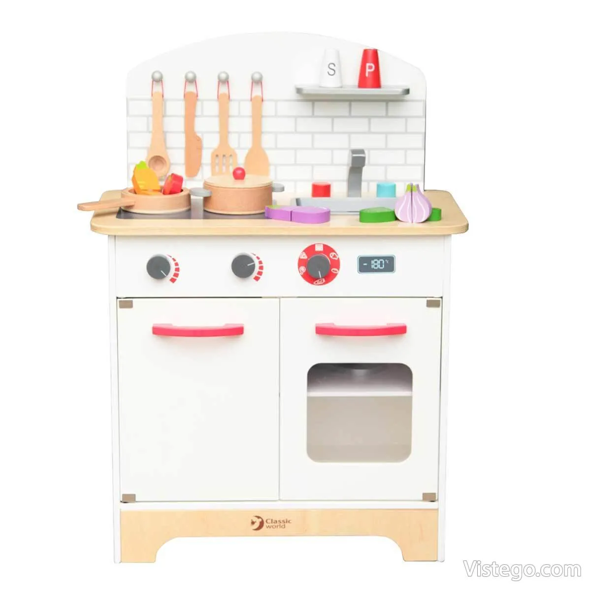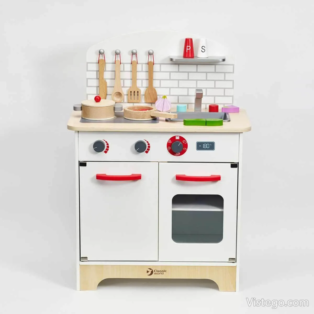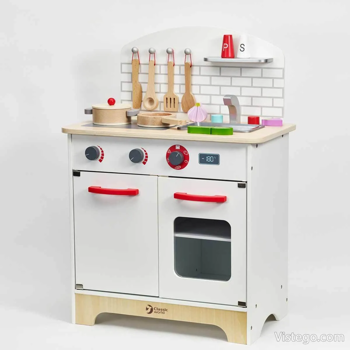 Тази детска кухня е от Classic World и е създадена като пространство за игра, в което детето може да имитира познати дейности и да развива социални умения. Дървената кухня за игра подпомага самостоятелното измисляне на сюжети: кой е готвачът, кой сервира и кой „поръчва“ менюто. В процеса детето упражнява споделяне, редуване и договаряне на роли, а това прави играта подходяща както за самостоятелни моменти, така и за игри с приятели или братя и сестри.