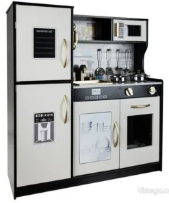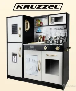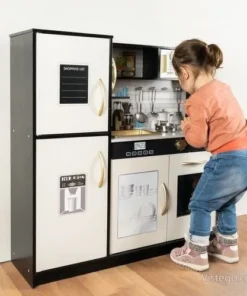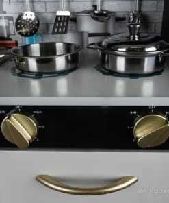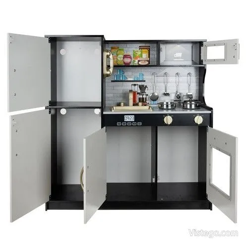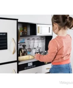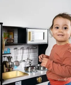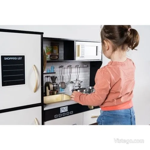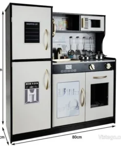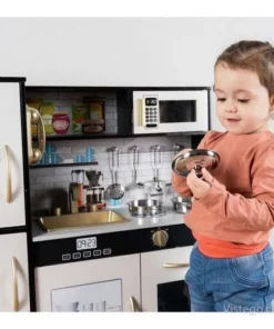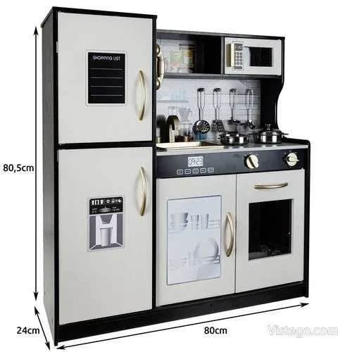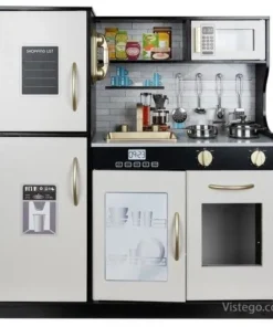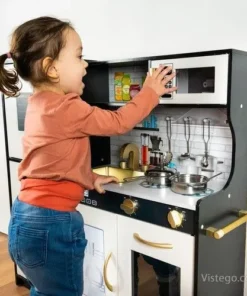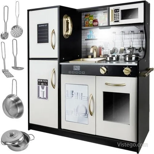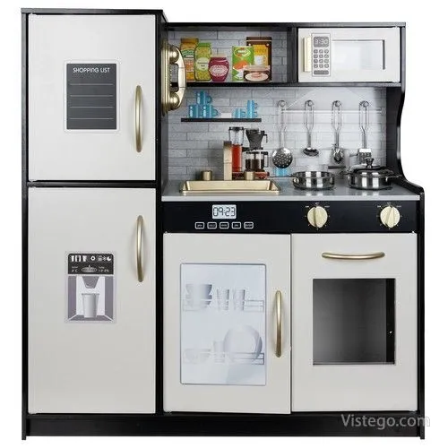 Дървена кухня за игра с реалистични ефекти, лампа и богати аксесоари. Подходяща за ролеви игри у дома и детска стая.