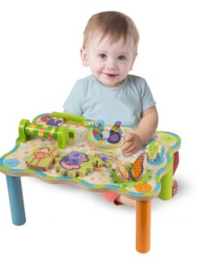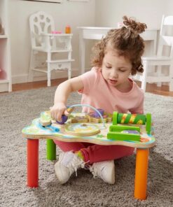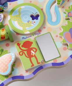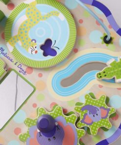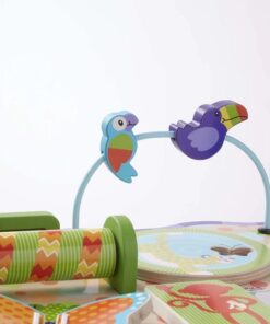 Дървена маса с активности за бебе Джунгла Melissa & Doug. Дървена маса за бебешки активности, съдържаща множество активности, като зъбни колела за завъртане, тръба за валцуване, мъниста за плъзгане, клапи за отваряне, колело за завъртане и лесни за хващане парчета, за да обърнете, бутате и дръпнете, като същевременно всичко това насърчава важни умения за развитие при децата. Всяко едно животинче има своето предназначение. Детето ще открие какво е то по време на игра. Заниманията с тази играта ще развият фината моторика, наблюдателността, а цветните фигурки ще грабнат вниманието на детето. Дървената маса с дизайн на джунгла бързо ще се превърне в най-добър приятел на детето. Разгледайте още от категорията “Бебешки играчки” ТУК