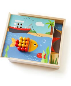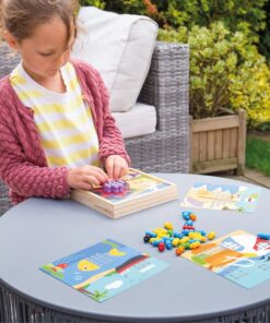 Дървена мозайка за деца Морски свят Bigjigs. Позволете на въображението на децата да се развихри с нашата красива ярка настолна игра Seaside Peg. С четири красиви плажни сцени, от които да избирате – включително риба, кофа, черупки и други – малките ръчички трябва просто да поставят дървените колчета в дупките, за да съживят сцената. Забавен дървен пъзел, тази настолна игра с колчета се предлага с 12 колчета в 8 различни цвята за богат избор на цвят. Какъв цвят ще бъде коремът на чайката? Какво ще кажете за люспите на рибата? Дъските с колчета са фантастичен начин за децата да развият координацията между ръцете и очите, сръчността и уменията си за разпознаване на цветовете. Когато времето за игра свърши, морските арт сцени и колчетата могат да бъдат прилежно съхранени в компактната дървена кутия, така че нищо да не се изгуби! Изработен от висококачествени материали с отговорни източници. Подходящи за деца бои и лакове. Отговаря на действащите европейски стандарти. Разгледайте още от категорията “Дървени пъзели” ТУК!