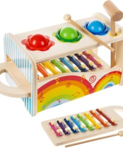 Дървена музикална играчка с чукче Kruzzel. 8-тонни чинели с пръчка, чукче, 3 топки и кутия за съхранение правят практичен комплект, който позволява многофункционална употреба. Броят на елементите в комплекта разнообразява и прави забавлението по-атрактивно. Продуктът е визуално интересен и естетически издържан; топлите, ярки и приказни цветове привличат вниманието на детето, стимулират активността и насърчават забавлението; чинелите, стоящи на рафт или шкаф, изпълняват декоративна функция и са интересна декорация на детската стая. Освен че запознават със света на музиката, учат на цветовете и помагат да се научите да броите. Играчката стимулира креативността и творческото мислене, а също така учи на търпение, подобрява паметта и концентрацията. Дървесината, използвана за направата на играчката и нежното покритие на ръбовете, правят продукта безопасен за здравето на детето. Разгледайте още от категорията “Музикални играчки” ТУК!