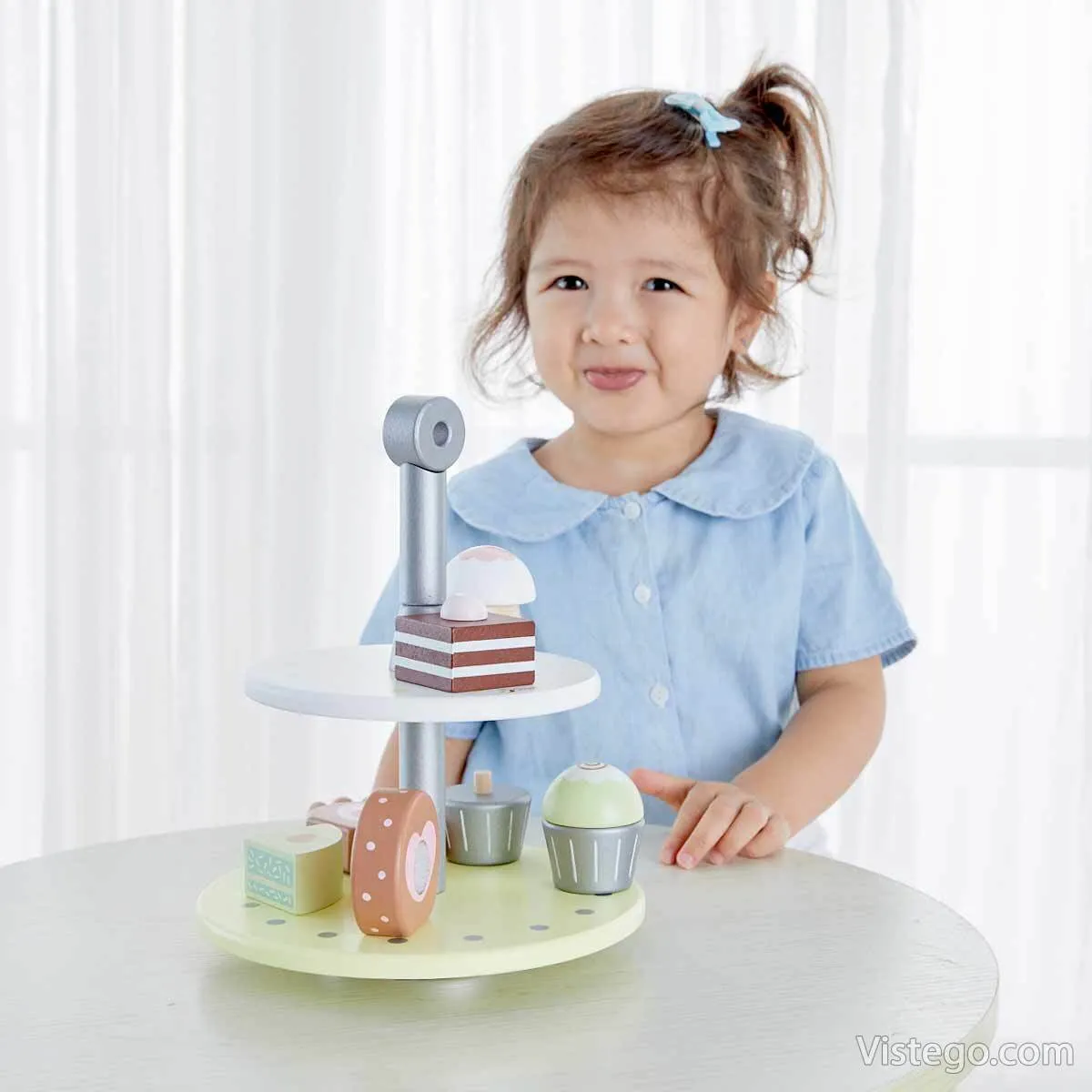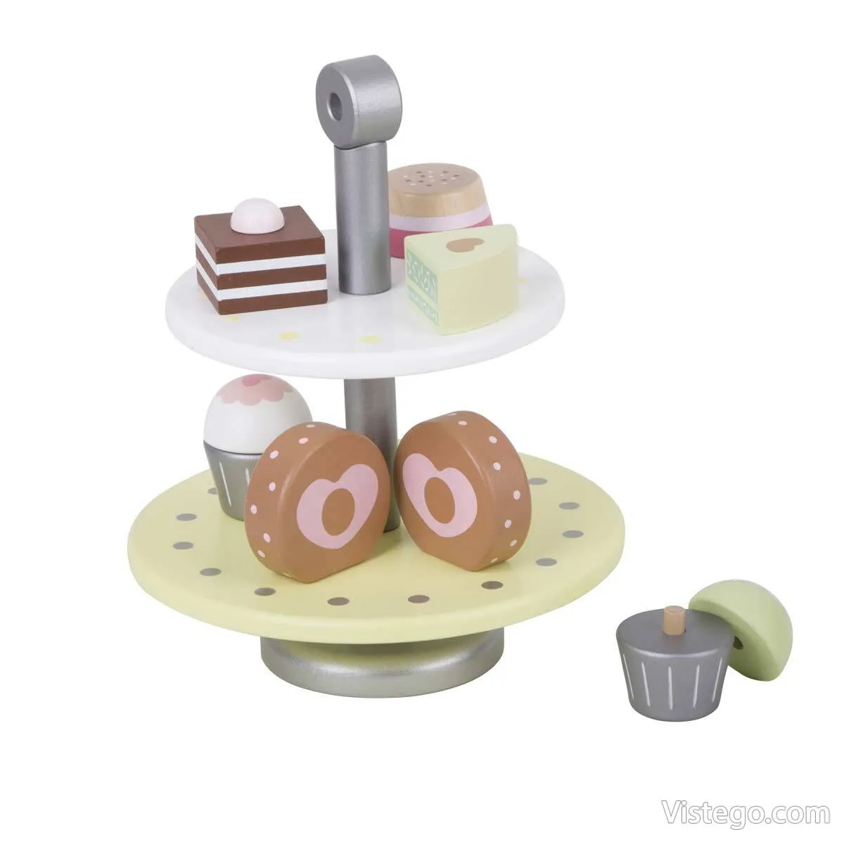 Дървена поставка за сладкиши превръща играта на „сладкарница“ в подредено и приятно занимание, при което детето може само да поднася своите цветни десерти и да изненадва мама и тати с „почерпка“ у дома.