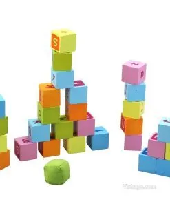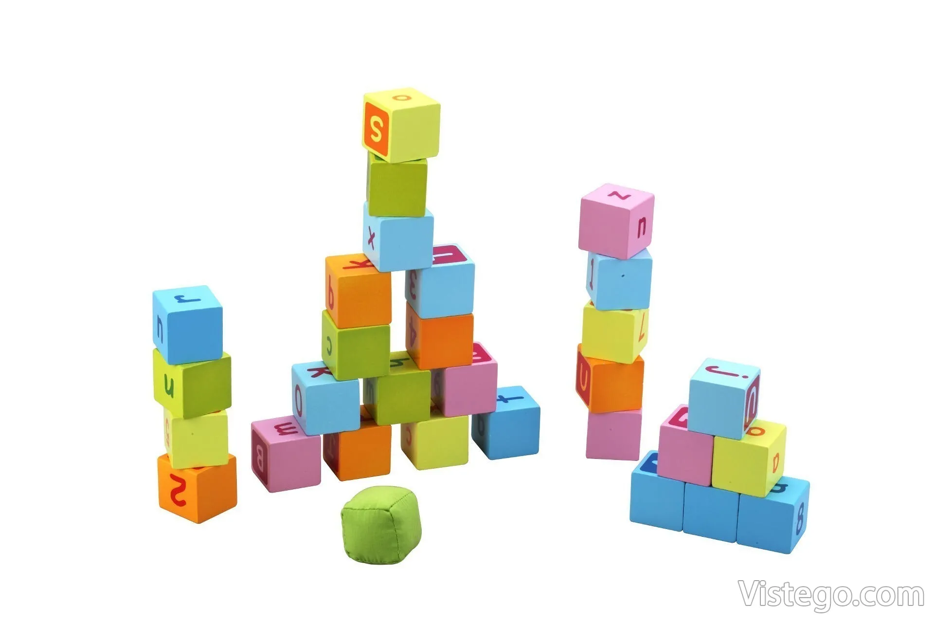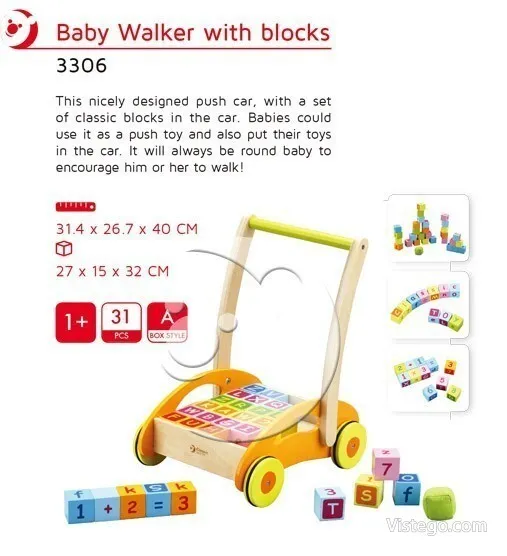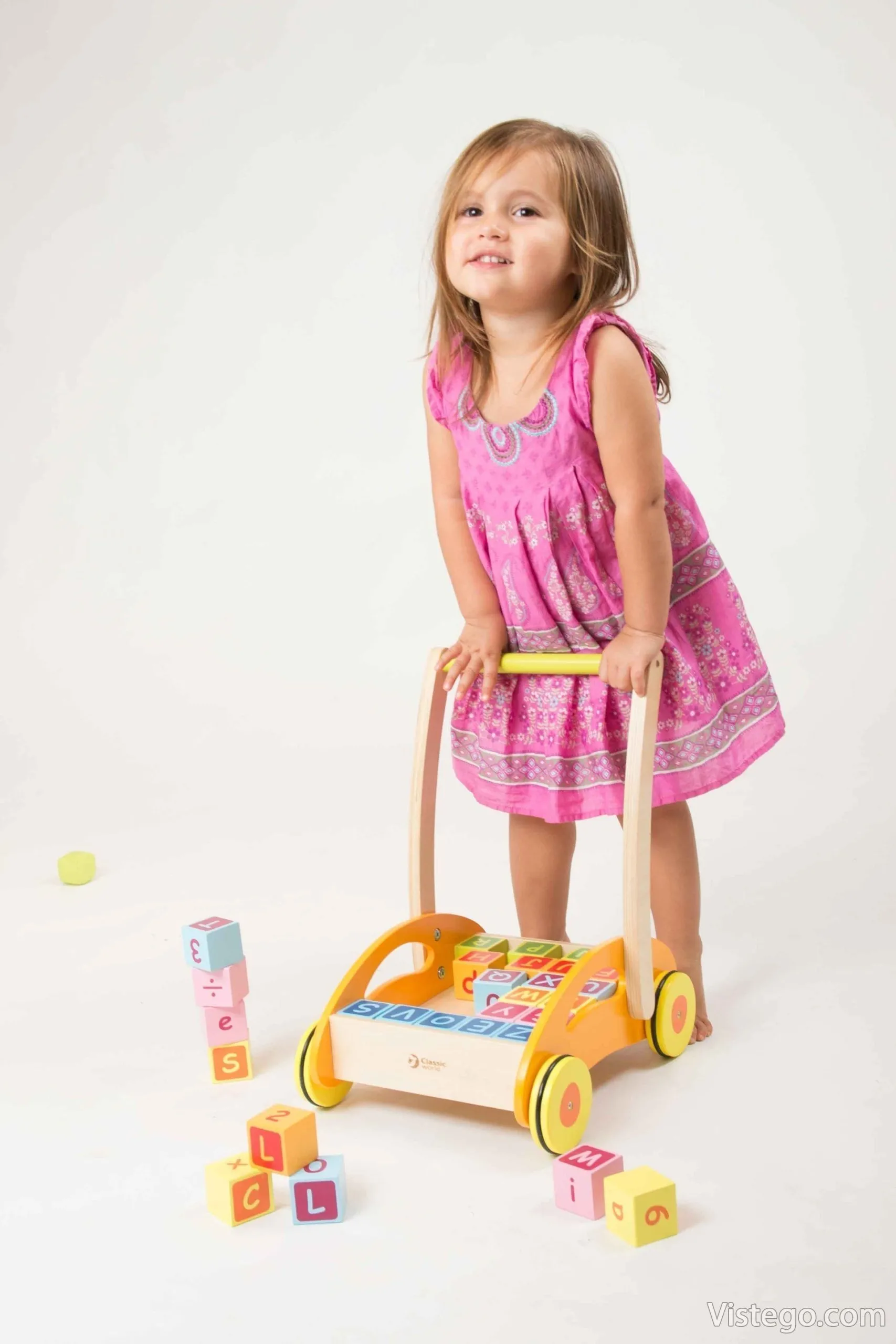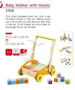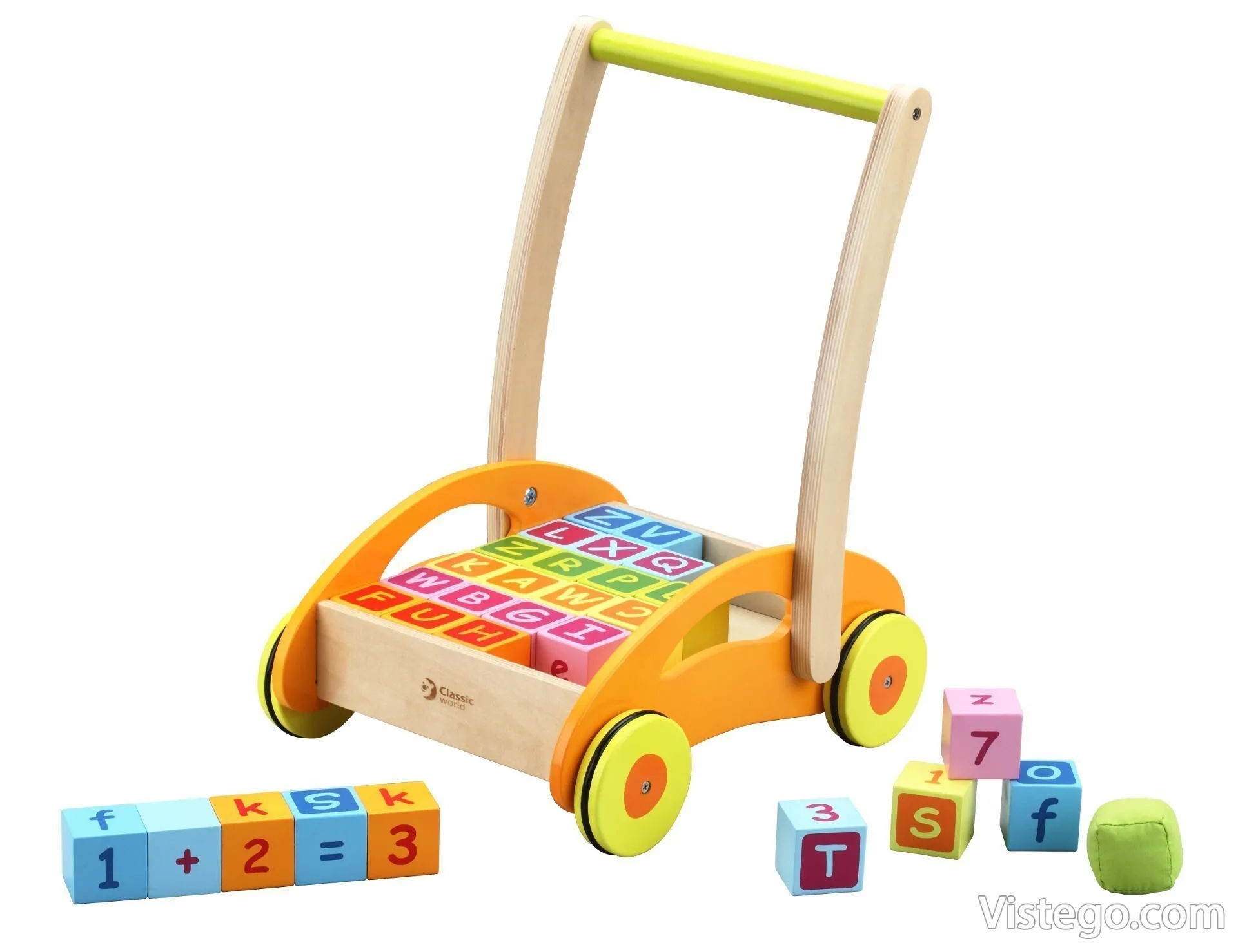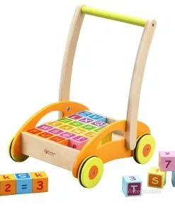 Дървена проходилка с кубчета за игра, която съчетава бутане и забавление у дома или навън и насърчава по-уверено движение.