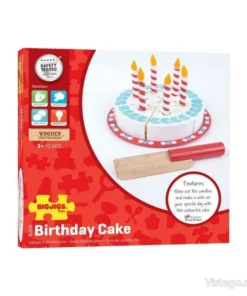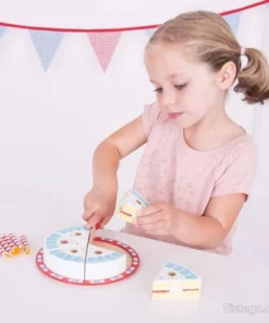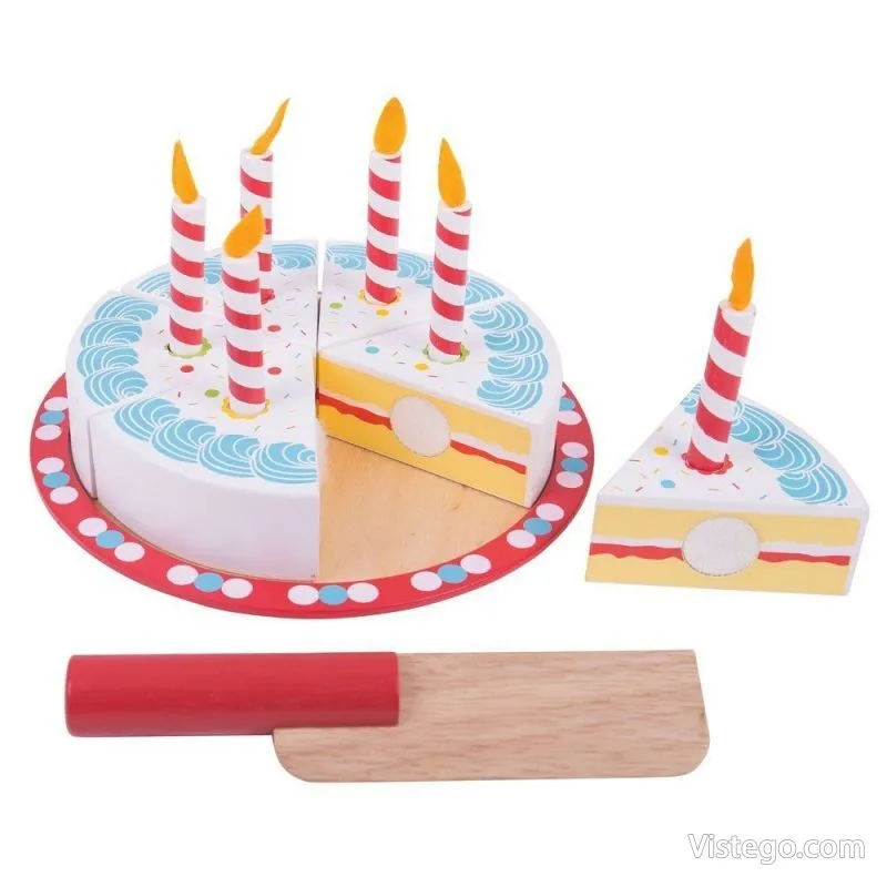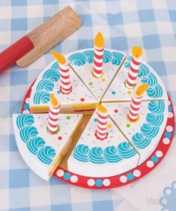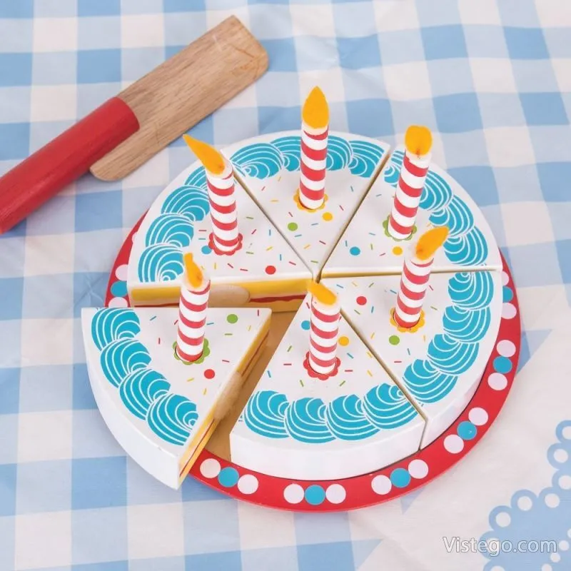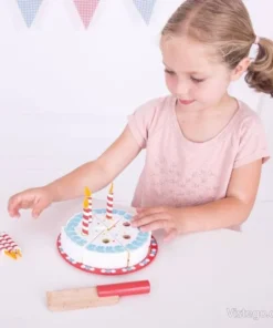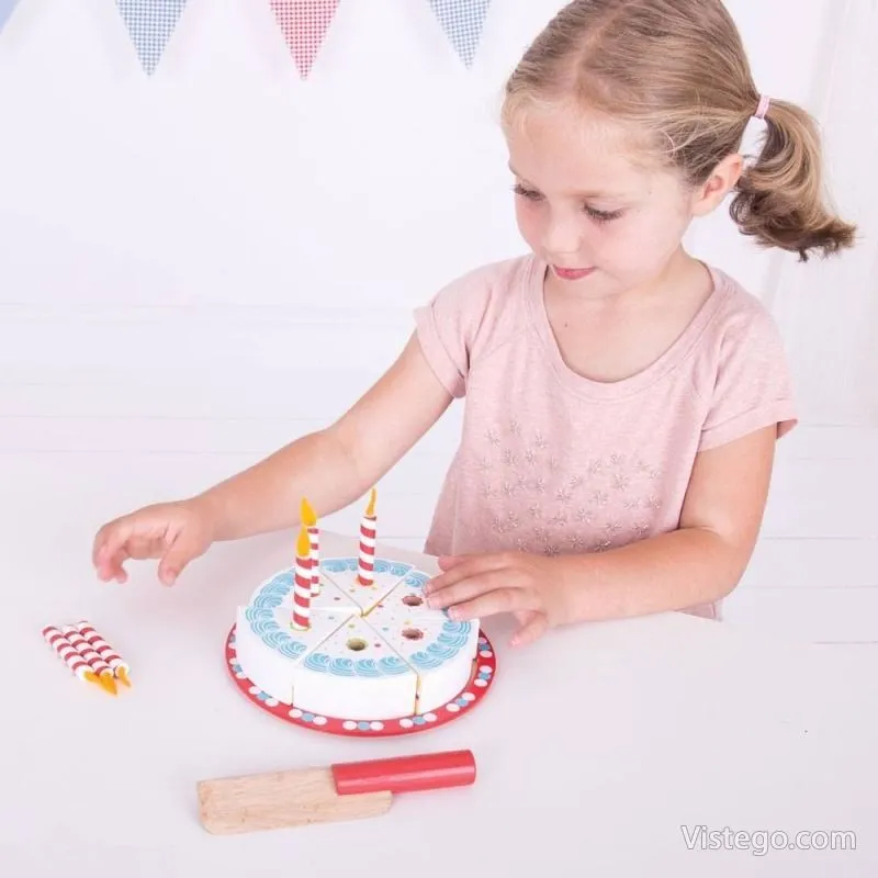 Играта с тортата подпомага развитието на фините моторни умения, математическите умения и ролевата игра. Всички части от комплекта са боядисани с нетоксични бои, което е важно при детските занимания. Свещичките могат да се слагат и махат, така че детето да променя „украсата“ според своя сценарий.