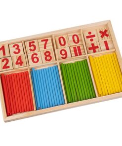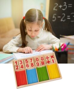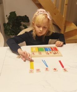 – ВКЛЮЧЕНО: 48 пръчки, 19 блокчета с цифри, 5 блока със символи на математически операции, дървено чекмедже за пръчици и блокчета