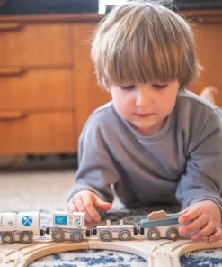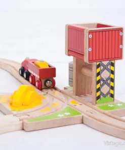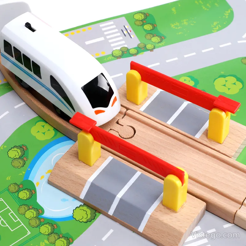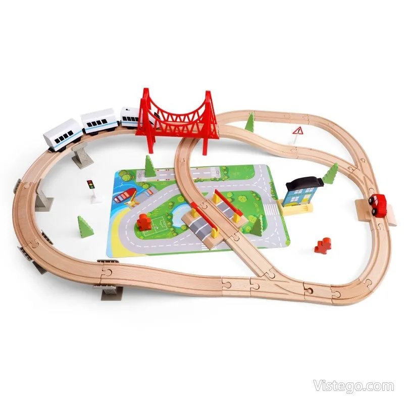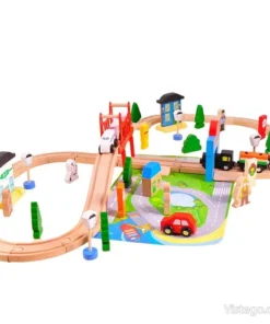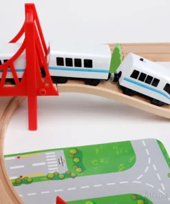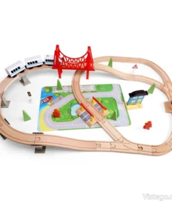 Дървени релси и влакче за детска игра с релси, гара, мост и аксесоари. Подходящо за деца над 3 години и разнообразни трасета.