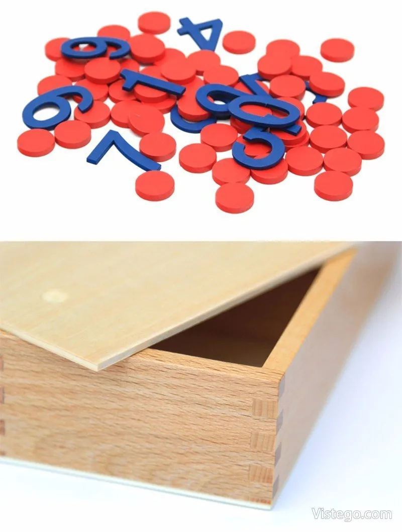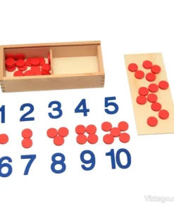 Комплектът е Монтесори материал, изработен от дърво, организиран в дървена кутийка с капак. Вътре са подредени цифрите и отделни чипове, които съответстват на количеството към всяко число. Така детето не просто „разпознава“ символа, а го съпоставя с реален сбор от отделни единици, което прави ученето по-ясно и устойчиво.