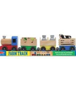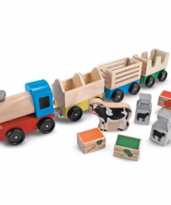 Дървено влакче с аксесоари Ферма . Този дървен влак е точно това, което е необходимо за транспортиране на нова крава или за транспортиране на кутии с мляко, плодове и зеленчуци до пазара. Въображението на вашия млад инженер ще бъде ангажирано от цветния двигател и трите взаимозаменяеми вагона. Ще бъдат осигурени часове забавление, докато детето ви товари и разтоварва вагоните и се преструва, че управлява влака. Разгледайте още от категорията “Дървени влакчета” ТУК!