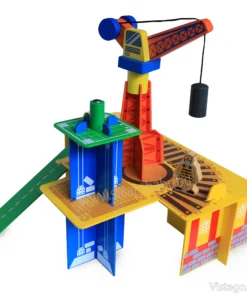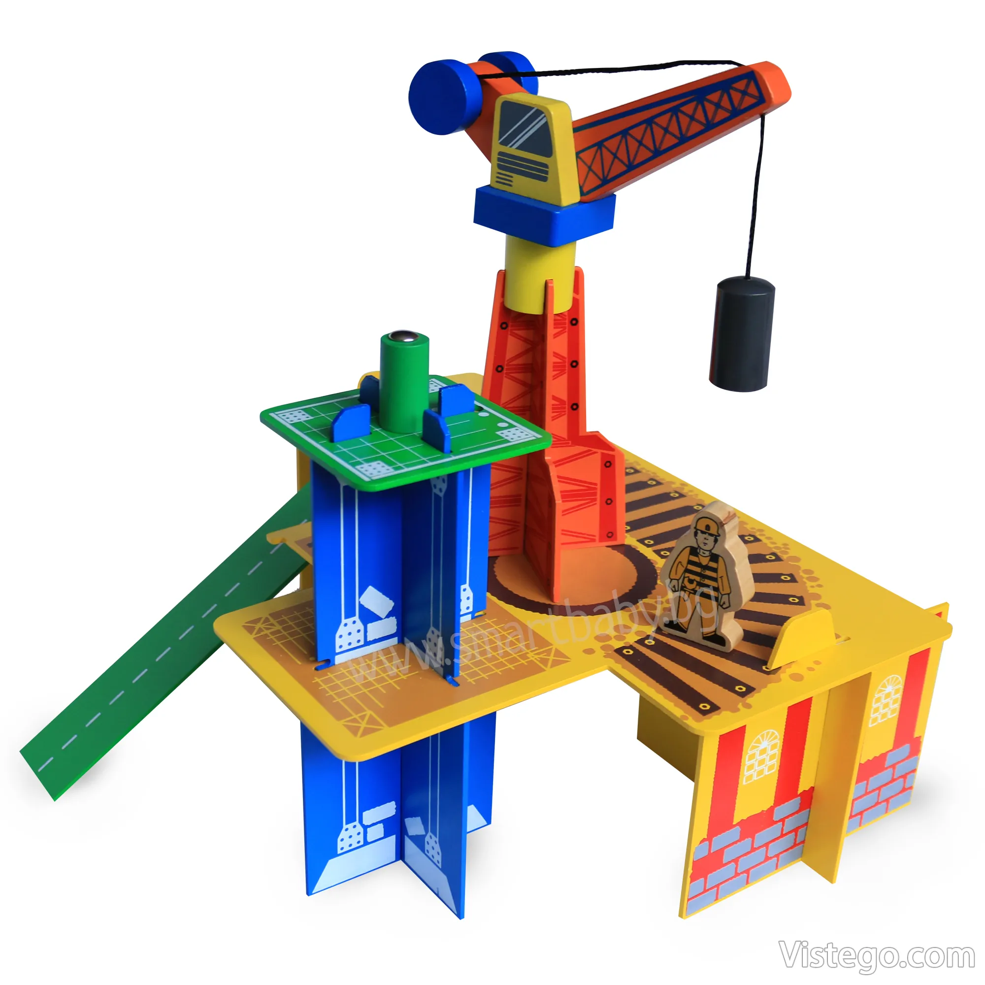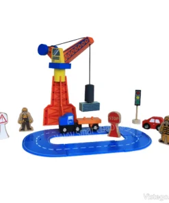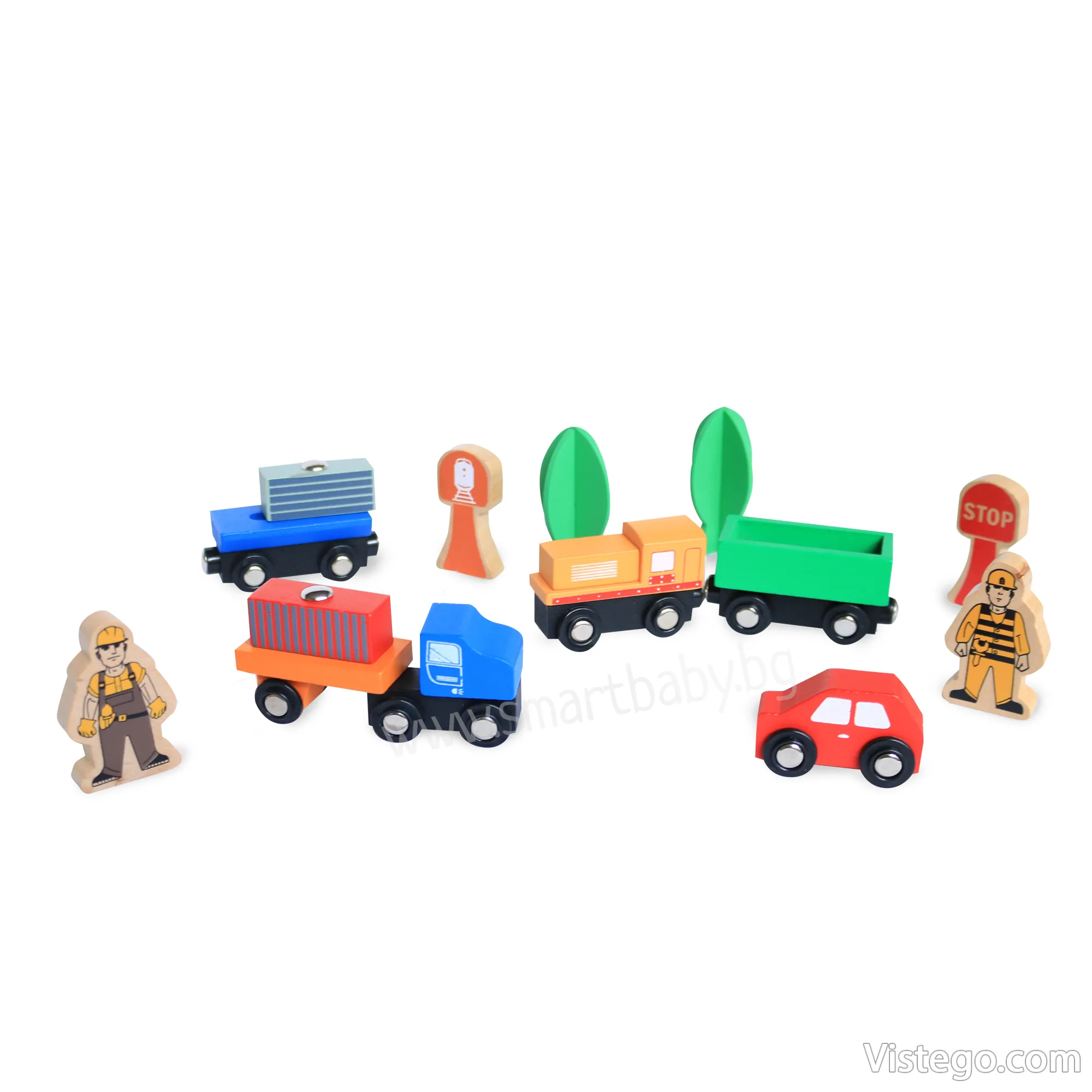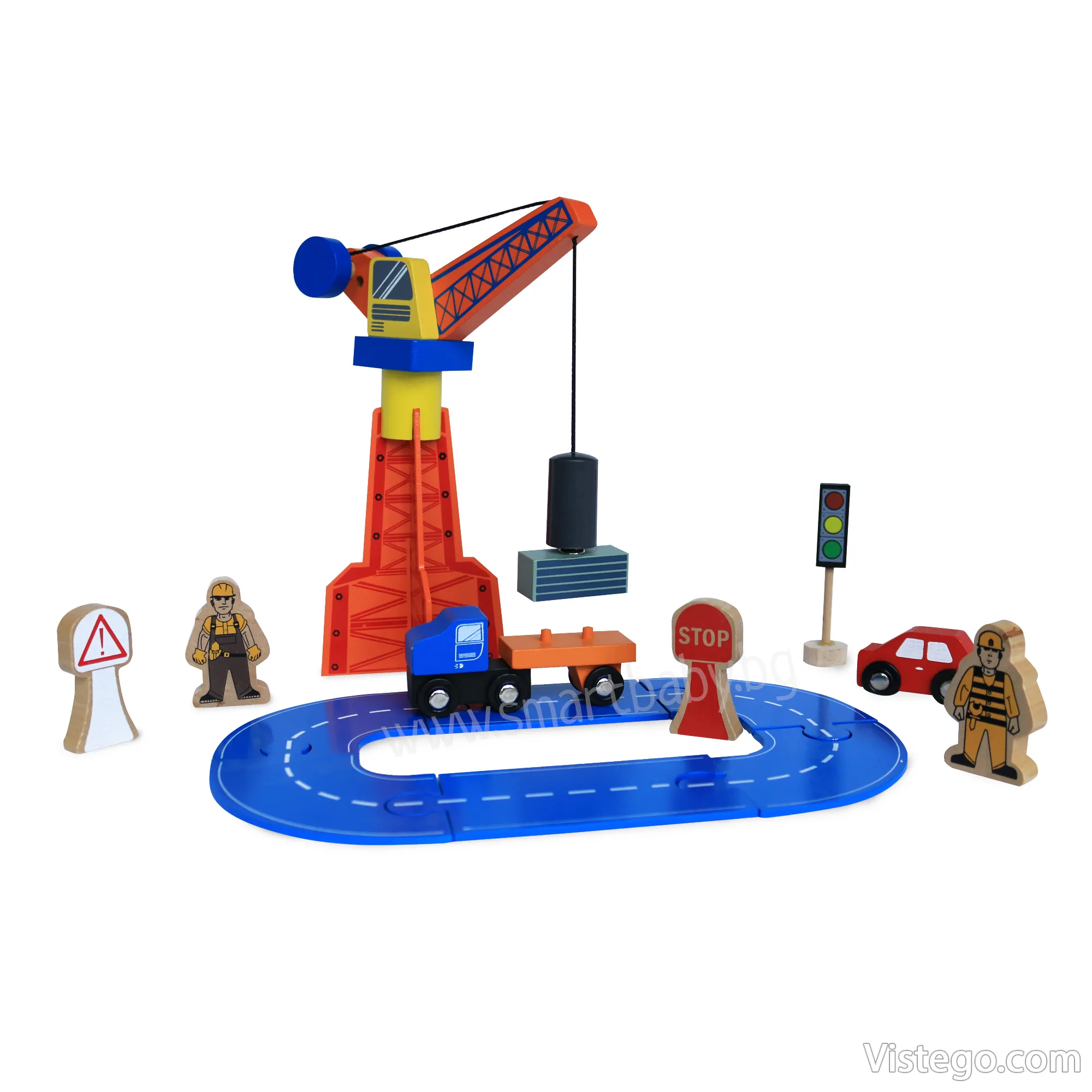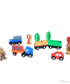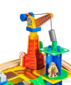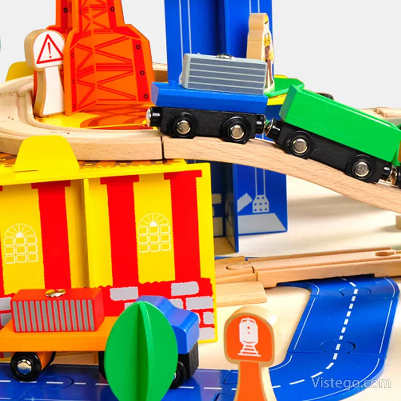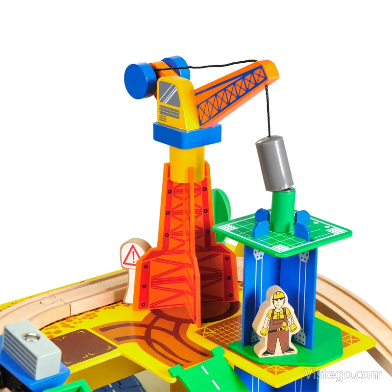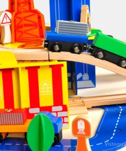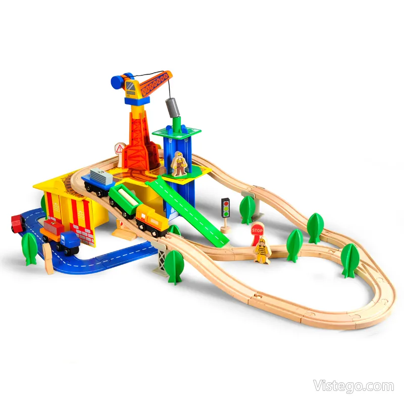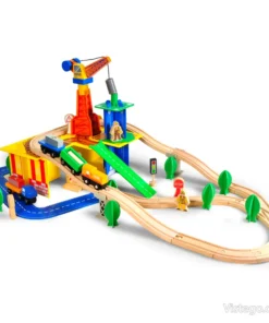 Дървено влакче с релси с универсални елементи за сглобяване на трасе и сюжетна игра. Включва влак с магнити, кран и аксесоари.