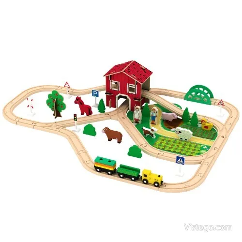 Дървеното влакче с релси е удобно за игра на пода в детската стая или в хола, защото позволява детето да започне с малко трасе и постепенно да го разширява. Фермерските елементи и фигурките дават възможност да се разиграват кратки истории: доставяне на „товар“, спиране на прелез, преминаване през тунел или разпределяне на животните около фермата. Това прави играта подходяща и за самостоятелни занимания, и за споделено време с родител.