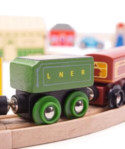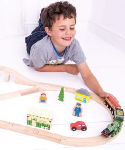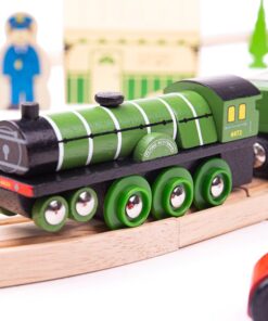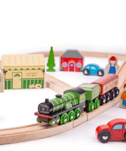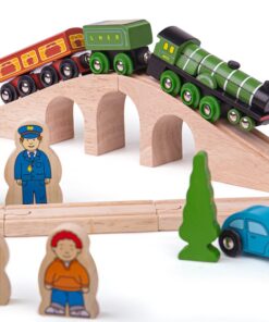 Дървено влакче с релси Летящия Шотландец Колекцията Bigjigs Rail Heritage предлага възхитителна гама от реплики от златния век на железниците. Имаме удоволствието да ви предоставим дървена влакова композиция, вдъхновена от най-известния локомотив в света, Летящият шотландец. Първоначално построен през 1923 г., Flying Scotsman е легенда, върната към живот от Bigjigs Toys. Този лицензиран комплект влакове включва легендарния влак играчка Летящ шотландец плюс дървена железопътна линия с виадукт и две кръстовища. Билетна каса, коли, дървета, работници и селяни също помагат за завършване на провинциалния пейзаж. Летящият шотландец е класически дървен влак, който никога няма да излезе от мода. Състои се от 42 игрални фигури. Повечето други големи марки дървени железопътни линии са съвместими с Bigjigs Rail. Изработен от висококачествени материали с отговорни източници. Отговаря на настоящите европейски стандарти за безопасност. Разгледайте още от категорията “Дървени влакчета” ТУК