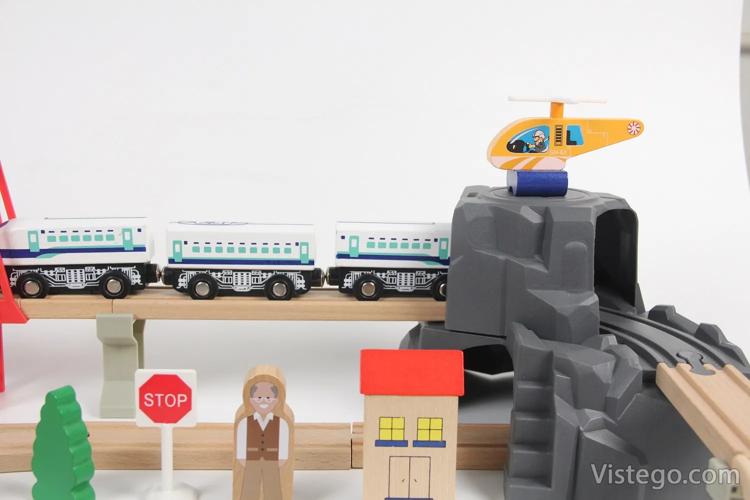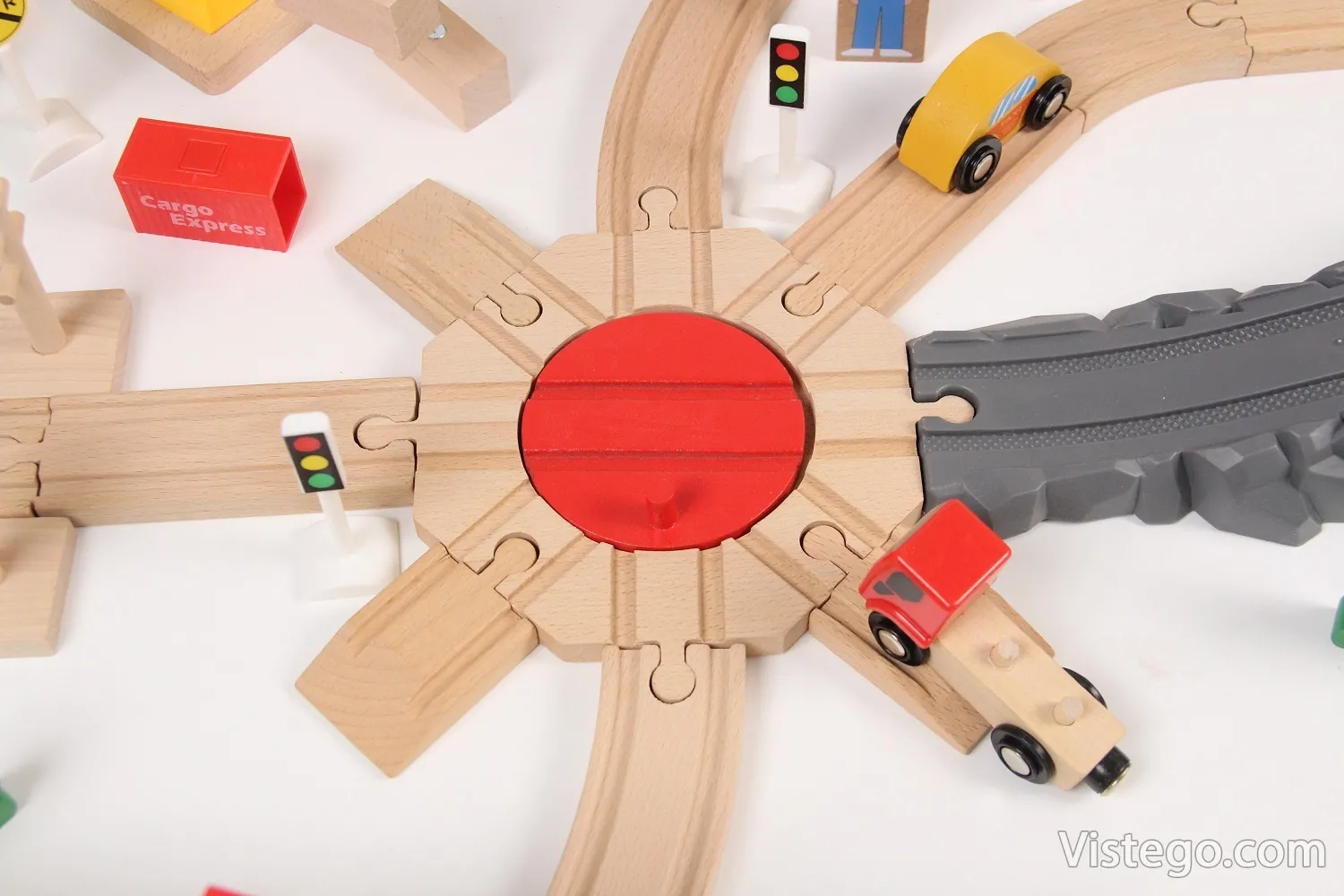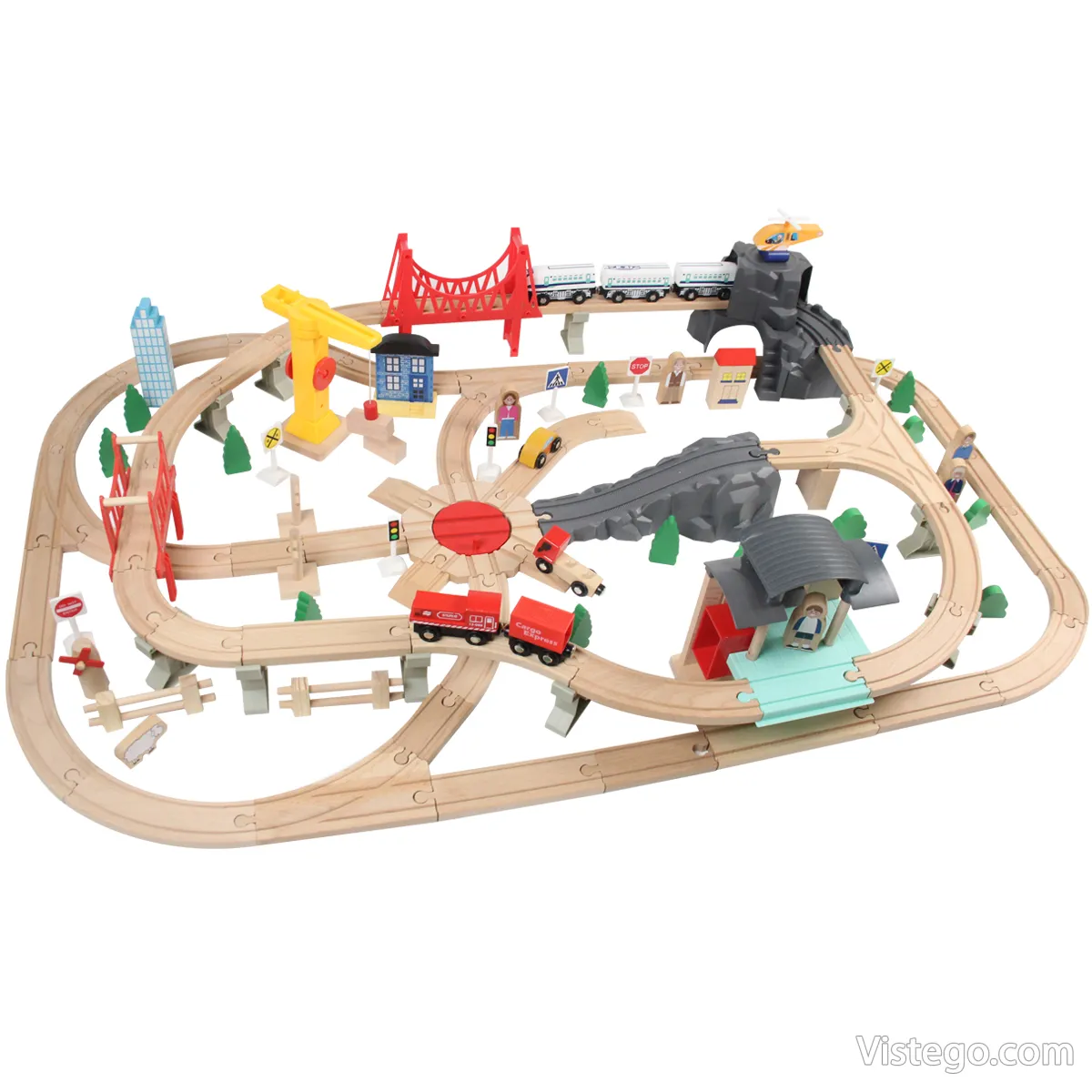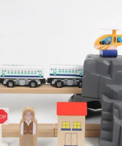 Комплектът включва дървени релси, локомотиви, вагони с магнитно закрепване, както и множество аксесоари като мостове, надлези, кръстовище, светофари и пътни знаци. Всички тези елементи дават възможност за създаване на безкрайни комбинации и сценарии. - Качествени материали