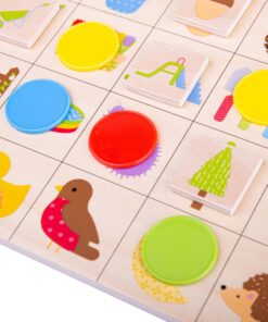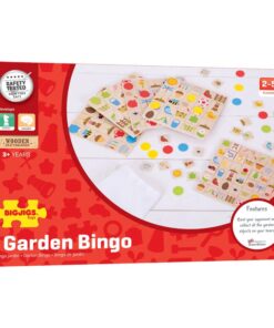 Дървено детско бинго Градина Bigjigs. Победете опонента си и първо съберете всички градински предмети на дъската си с тази вдъхновена от природата бинго игра за деца. Забавен обрат на класическото бинго, в Garden Bingo, един играч действа като „повикващ“ и има главната дъска и плочките с картинки. Всеки играч има дъска и набор от цветни броячи. Повикващият избира плочка една по една, ако играчите имат тази плочка, те покриват картината с цветния си брояч. Играта продължава, докато един играч има линия и след това фул хаус. Това забавно и цветно бинго за деца предоставя забавен начин за младите учащи да практикуват основен речник. Чудесен начин за развиване на умения за съвпадение и концентрация. 2-5 играчи. Изработен от висококачествени материали с отговорни източници. Отговаря на настоящите европейски стандарти за безопасност. Състои се от 146 игрални фигури. Разгледайте още от категорията “Настолни игри” ТУК!