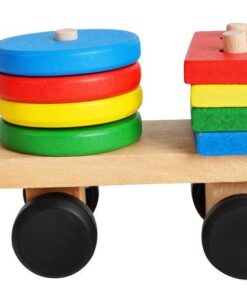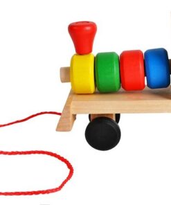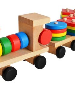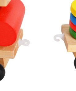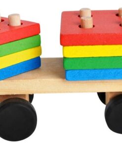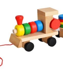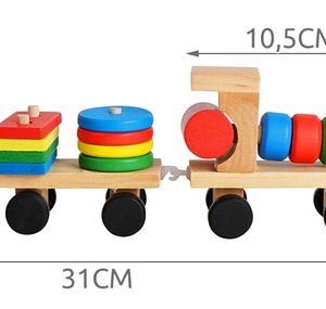 Дървено детско влакче – шарена низанка за деца. Приказно цветно дървено влакче с блокчета е весела играчка за подреждане и нанизване, която ще се хареса на всяко малко дете. Връв, прикрепен към опашката, ще позволи на детето ви да дърпа опашката! Вагоните, прикачени към локомотива, са и за сортиране на блокчетата! Всяко вагонче има болтове, на които детето нанизва подходящите форми на блокове. Колелото има 1 щифт, правоъгълник 2, триъгълник 3 и квадрат 4 щифта. Детето се учи да свързва форми и цветове, тренира усещането за допир. Играта с влака поддържа ръчни умения, тренира сръчност и ръчна точност. Това ще позволи на вашето дете да достигне следващия етап на развитие. Дървените играчки са трайно предложение, което ще зарадва всяко малко дете. Класическата красота на дървото и неговата издръжливост го карат винаги да се радва на голямо признание. Освен това те са безопасни за всяко малко дете. Суровината, която идва от природата, означава, че дори детето да сложи играчка в устата си, то няма да влезе в контакт с опасни материали. Играчките са боядисани със специална боя, която е безвредна за здравето. Включва: локомотив, 2 вагона, 22 блокчета.