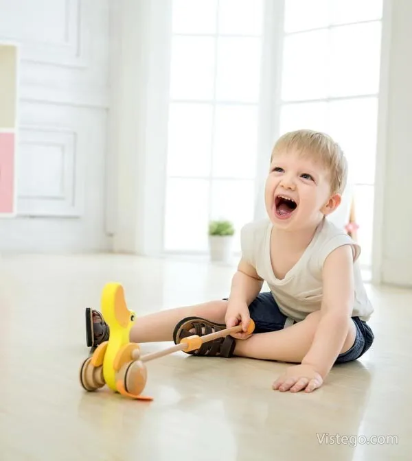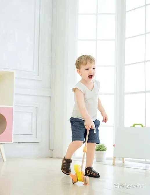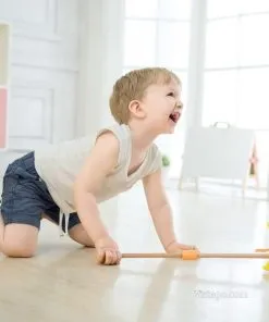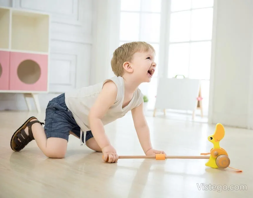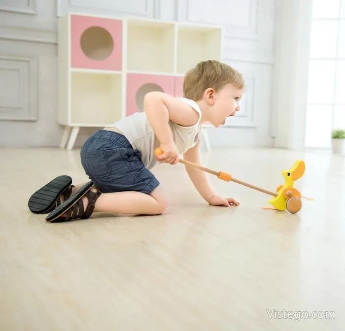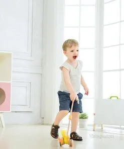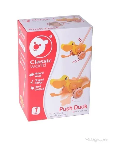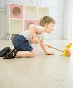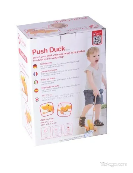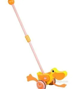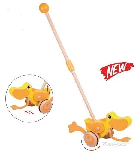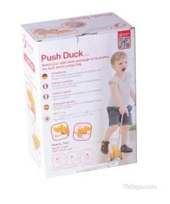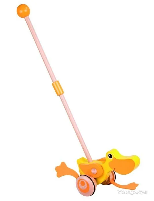Дървено пате за бутане, което насърчава първите крачки и забавлява със звуци при движение. Подходящо за прохождащи деца.