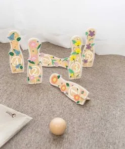 Този комплект представлява детска игра за подреждане и събаряне на кегли с топка за бутане. Детето може да подреди кеглите, да избере разстояние и да търкулне топката, докато се учи да преценява посока и сила. Дървеният боулинг с цветя е подходящ за спокойни следобеди вкъщи, за игра на терасата или за занимания в детската стая, когато искате активност без сложни правила.