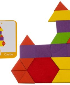 Дървен детски пъзел с геометрични фигури. Учебният пъзел, включен в офертата, развива и учи децата да разпознават цветовете и формите на геометричните фигури. Отделните фигури се предлагат в различни цветове и комплектът съдържа карти с различни нива на трудност, които са снабдени със звездички и картинки за подреждане и съставяне на фигурите по картинките. Дървеният детски пъзел ще развие мисленето на дететови в триизмерното пространствои ще засили умението му за координация.