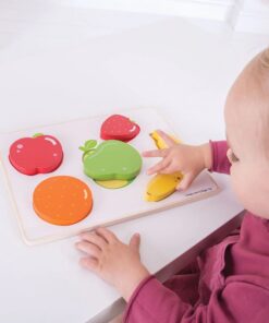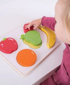 Дървен детски пъзел с плодове Bigjigs. Този дървен пъзел представлява прекрасен начин за децата да се забавляват и учат едновременно. Включването на цветни фрукти – ябълка, портокал, банан, ягода и круша – предоставя възможност за разпознаване на форми и цветове, докато малките учат как да поставят всяка част от пъзела на правилното място върху дъската. Размерът на дървените части е специално проектиран, за да бъде удобен за малките ръчички, като ги улеснява да ги хващат, преместват и изучават. Това не само помага за тяхното физическо развитие, но и подпомага развитието на техните координационни умения. Освен физическите предимства, пъзелът има и образователна стойност. Той подпомага ранното запознаване със здравословното хранене, представяйки плодовете и ги асоциирайки с техните форми и цветове. Този метод е прекрасен начин да се поощри интересът към плодовете и здравословното хранене още от ранна възраст. Важната роля, която играчките изиграват в развитието на детето, се допълва от различните ползи от този пъзел. Освен уменията за съответствие и концентрация, децата могат да развиват и своя речник, идентифицирайки плодовете. Спазвайки европейските стандарти за безопасност, този пъзел не предоставя само забавление и образование, но и увереност на родителите в отношение на безопасността на играчката, с която техните деца се забавляват. Разгледайте още от категорията “Дървени пъзели” ТУК!