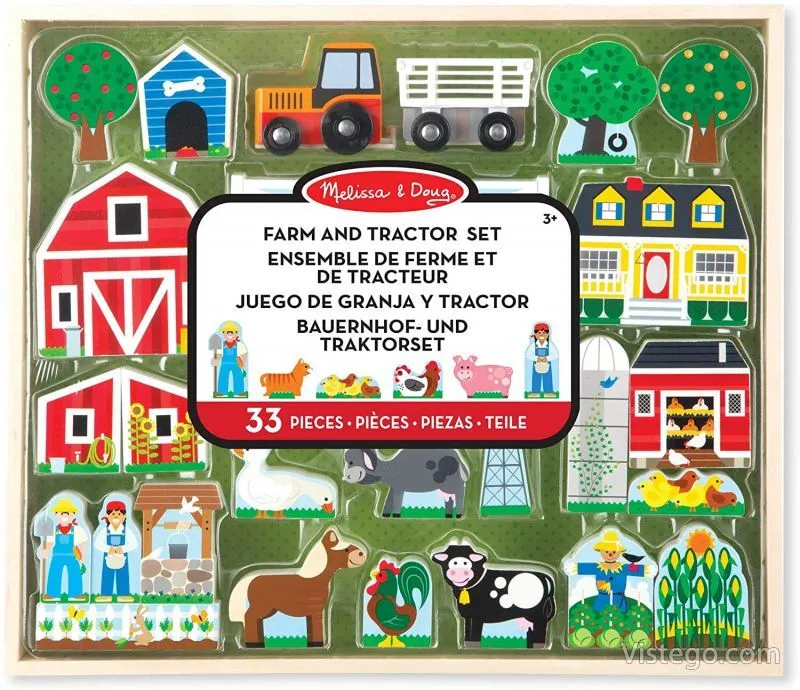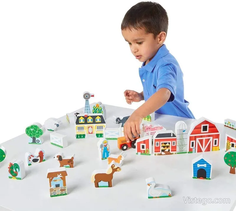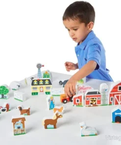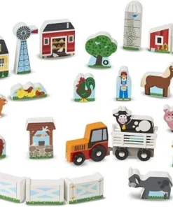 Елементите са ярко оцветени и замислени така, че да подканят към разказване на истории. Комплектът включва ферма с животни, сгради, дървета, трактор с ремарке и други елементи, които дават много варианти за подредба. Заниманията с комплекта подпомагат въображението и креативността, а манипулирането на малките части е естествен начин за упражняване на фините моторни умения.