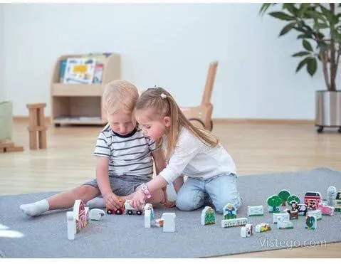 Този комплект за игра е създаден за въображаеми приключения, в които детето може да подрежда фермерската сцена отново и отново. Дървените елементи позволяват разнообразни комбинации: днес може да има работа около сградите, утре разходка край дърветата, а след това история с животните и превозването на „товар“ с превозното средство. Дървеният комплект за игра е подходящ за самостоятелна игра, но и за моменти, в които родител и дете измислят сюжет заедно.
