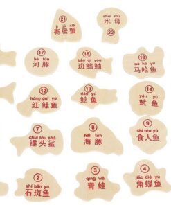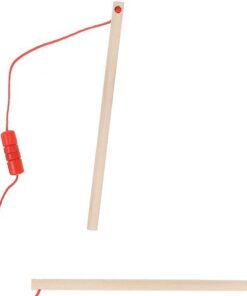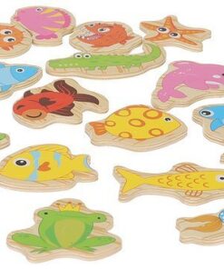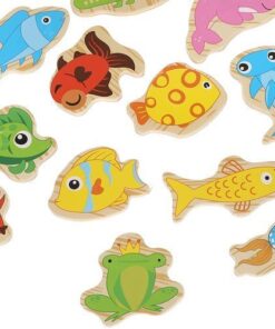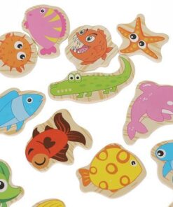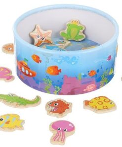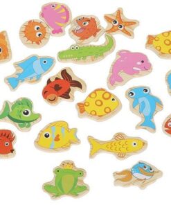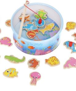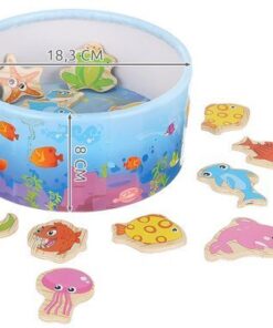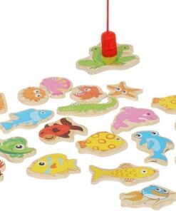 Дървен комплект за риболов – детска играчка. Играчката стимулира въображението, развива логическото мислене и зрителната памет; учи как да се асоциират форми и цветове, упражнява ръчна сръчност на ръцете и чрез съвместна игра оформя социално поведение, като способност за интегриране и способност за сътрудничество в група. Под морските животни има цифри и имената им на китайски – детето може да научи нов език, докато играе. Малкото дете усвоява знанията много бързо през първите си години, така че изучаването на чужд език ще донесе много ползи в по-късния му живот. Играчката е с меки ръбове, а повечето елементи са изработени от дърво – това я прави безопасна за здравето на детето, за разлика от играчките от пластмаса. – играта е интересен комплект, състоящ се от 22 морски създания и 2 въдици; въдиците и морските създания имат малки магнити, което прави играта по-привлекателна и също така подобрява улова. Комплектът включва кутия, която може да се използва и като аквариум за игра. Естетическата стойност се влияе от добрата изработка, както и от ярките топли цветове; предизвиква интерес у детето и го насърчава да го използва многократно.