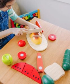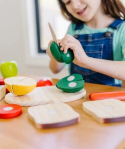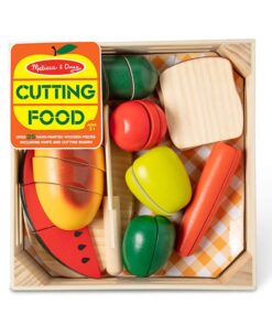 Дървен комплект Хранителни продукти Този дървен комплект храна за игра е идеален за млади готвачи, които искат да изследват малко забавление по време на хранене – без бъркотия! Включва осем парчета дървена храна, които могат да бъдат нарязани на 27 части, дъска за рязане и дървен нож. Нарязването на храната прави задоволително „хрупкане“ – и предоставя игриво въведение в понятията „цяло“ и „част“. Разгледайте още от категорията “Дървени играчки за готвене” ТУК