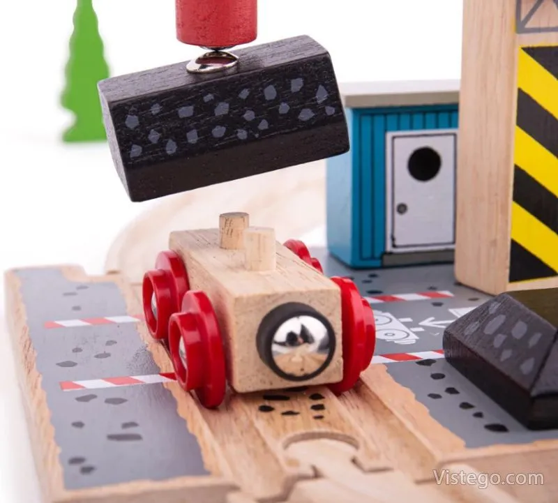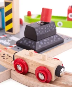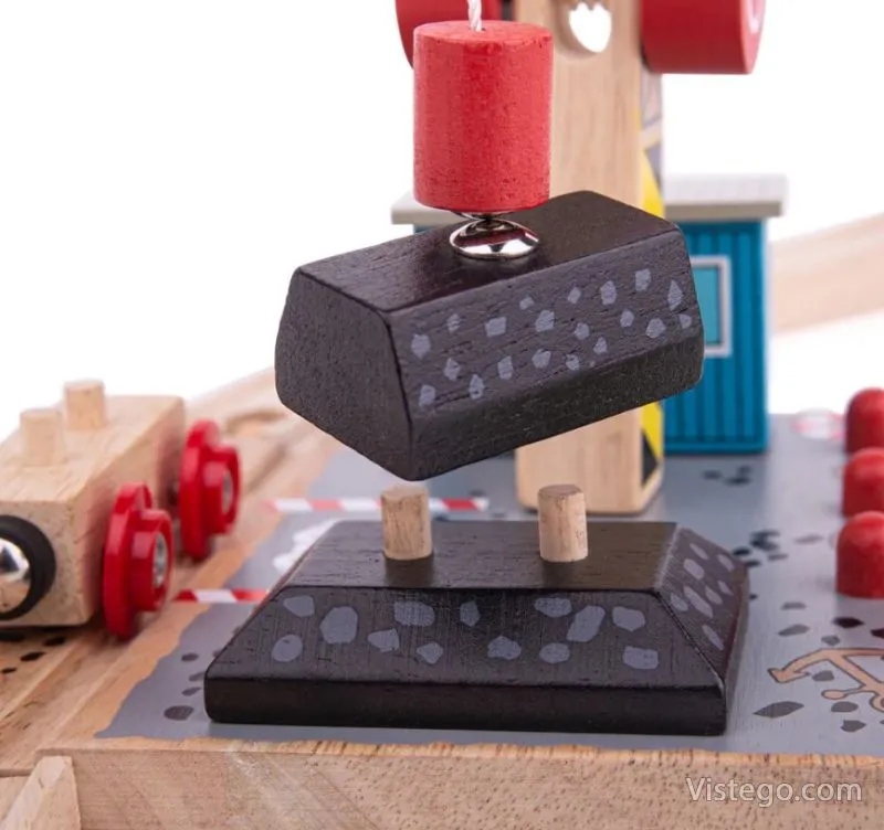 Този дървен кран с магнитна макара е част от влаков комплект и е замислен като реалистично допълнение към композицията. Магнитната макара е направена така, че да повдига въглищния товар и да го прехвърля между различни елементи в сцената. Така детето не просто подрежда релси и вагончета, а създава цял процес по товарене и разтоварване, който прави играта по-динамична и по-близка до „истинските“ действия от транспорта.