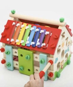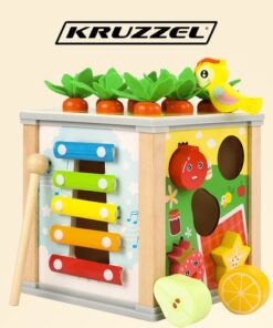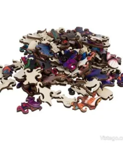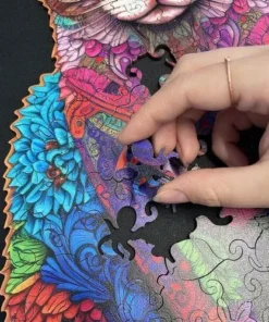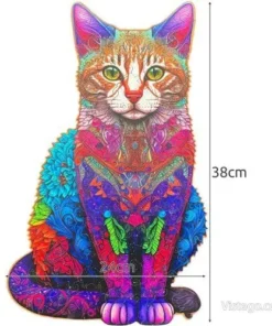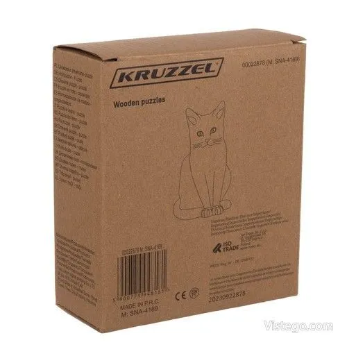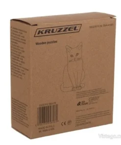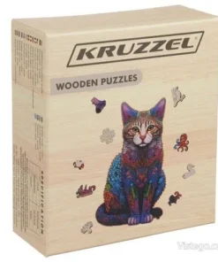 Дървен пъзел Kruzzel с форма на котка и цветни мотиви. Удобен за съхранение и чудесен за спокойна игра, фокус и търпение.