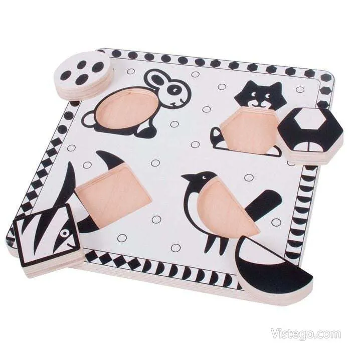 Характеристики на Дървен пъзел в черно и бяло с домашни любимци Bigjigs:
