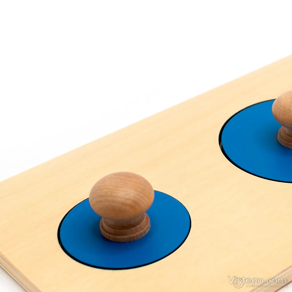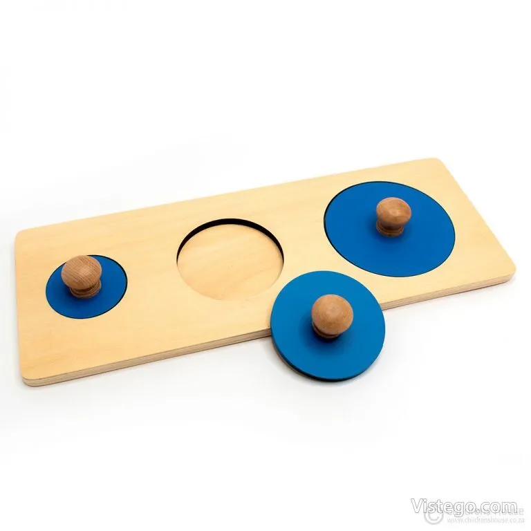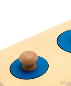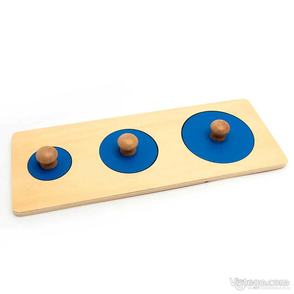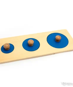 Комплектът включва правоъгълна дървена основа и три сини кръгчета с различна големина. В основата са изрязани отвори, като всеки от тях съответства на конкретен кръг. Задачата е детето да постави всички елементи на правилните места, докато постигне точна подредба. Тази ясна структура прави играта лесна за разбиране и подходяща за постепенно надграждане на уменията.