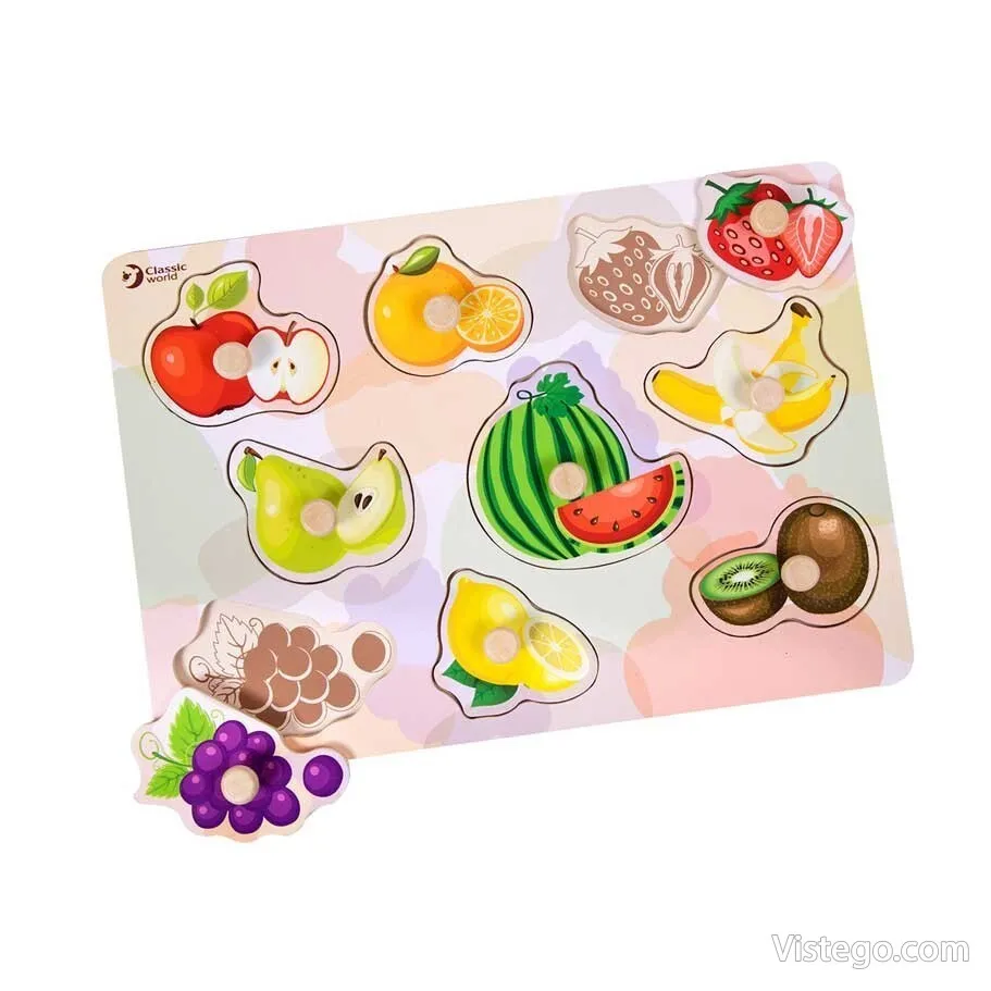 Ако търсите занимание, което комбинира разпознаване на форми и приятна игра, дървеният пъзел за деца с плодове е практично решение. Подреждането е ясно, дръжките улесняват работата, а детето постепенно се учи да довършва задачата самостоятелно и с интерес.