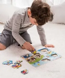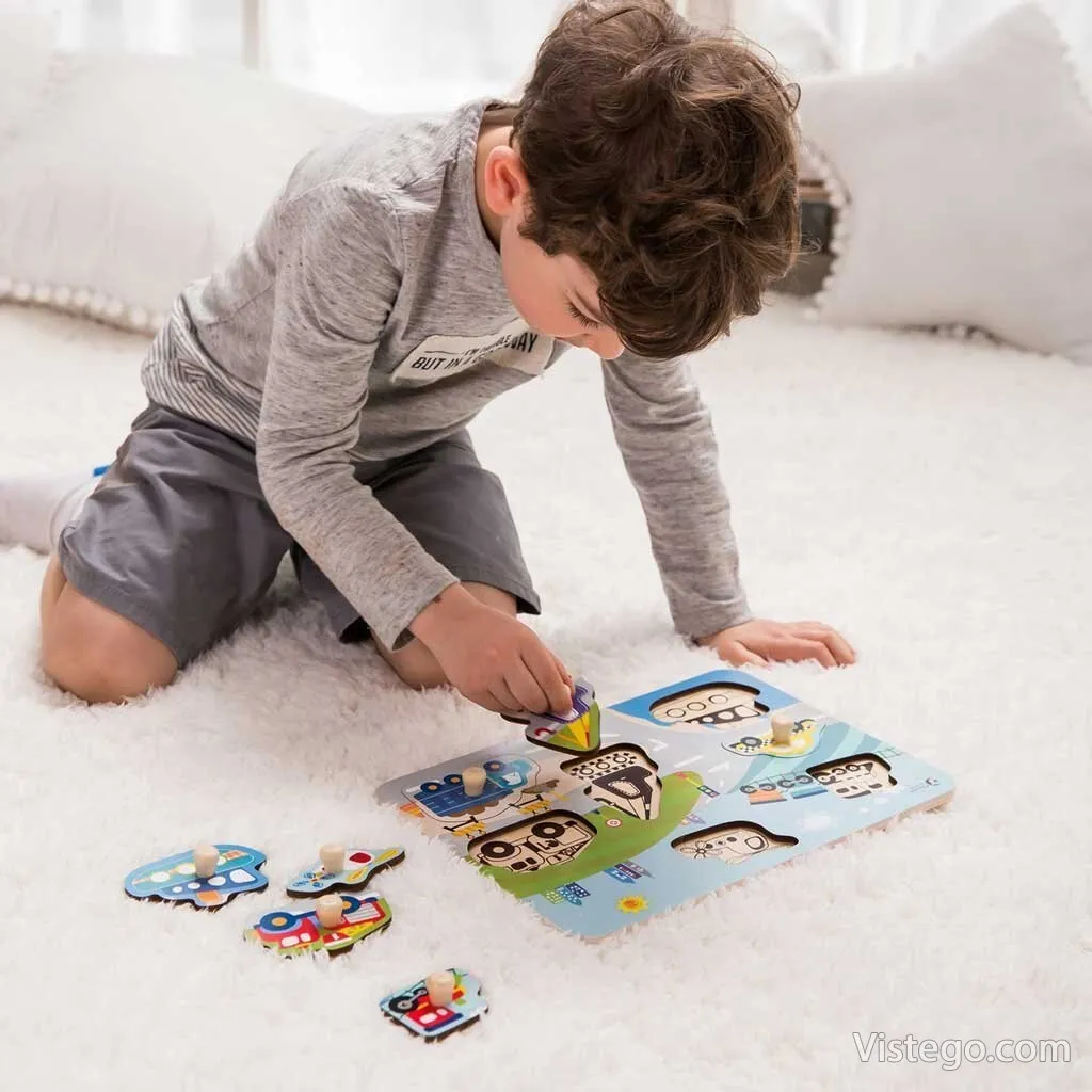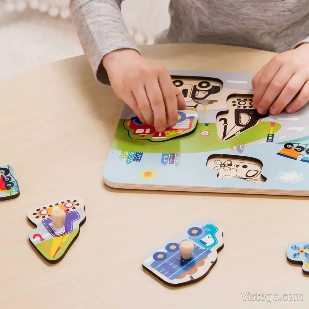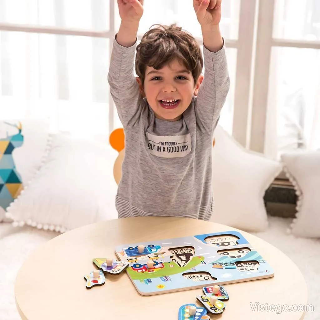 Дървен пъзел за деца на тема Трафик с удобни дръжки. Подреждане по форма, развива пространствено мислене и познания за превозни средства.
