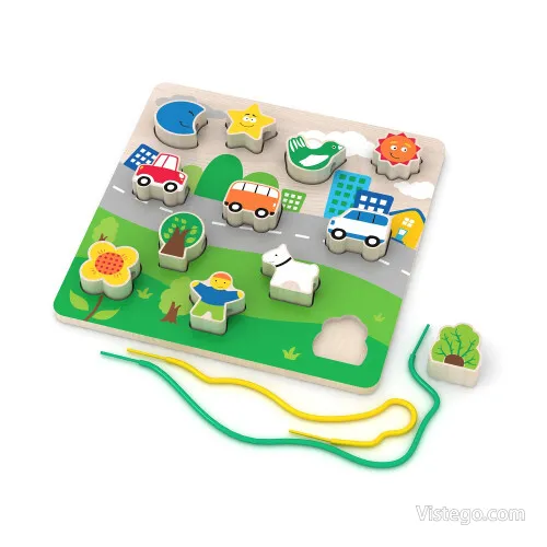 Дървен пъзел „градска среда“ с елементи за подреждане и отвор за връвчица. Подходящ за деца над 18 месеца.