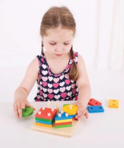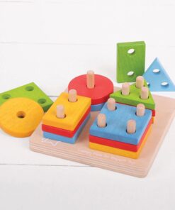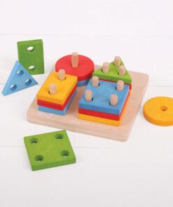 Дървен пъзел низанка с геометрични фигури Bigjigs. Идеалният първи дървен сортировач за форми, нашият First Four Shape Sorter запознава децата с формите и цветовете, докато играят. Сортирайте и свържете дървените форми в четири купчини. Страхотен начин да научите за числата и да насърчите разпознаването на форми. Всяка дървена форма се поставя върху закрепената основна дъска. Помага за развитието на сръчност и координация. Изработен от висококачествени материали с отговорни източници. Отговаря на настоящите европейски стандарти за безопасност. Състои се от 17 игрални фигури. Разгледайте още от категорията “Дървени низанки” ТУК