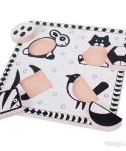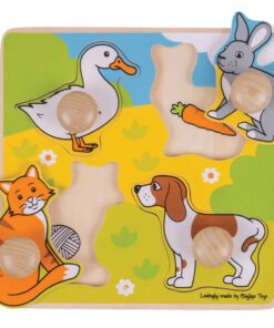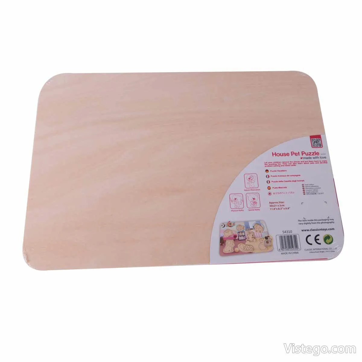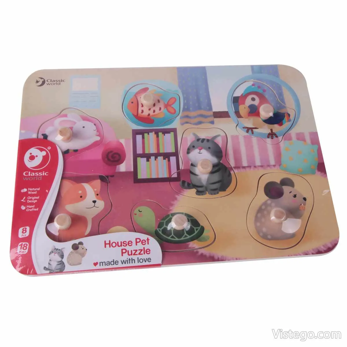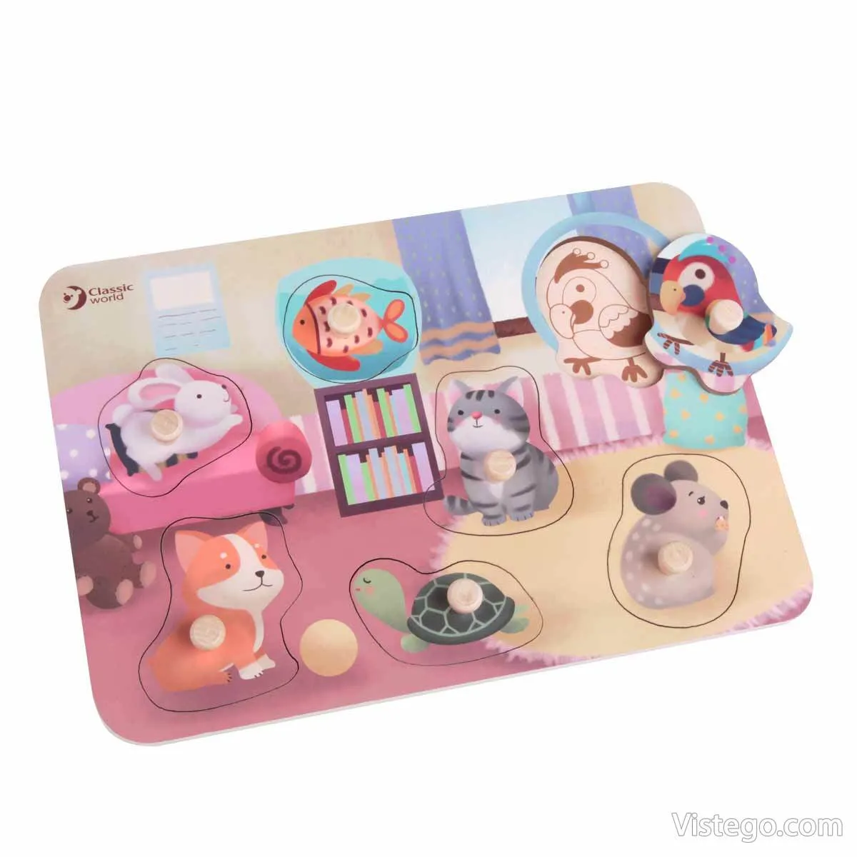 Дървен пъзел с домашни любимци за спокойна игра у дома. Удобни за хващане части, които насърчават фината моторика и координацията.