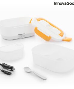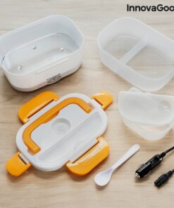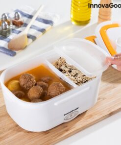 Електрическа кутия за обяд InnovaGoods е практична кутия за обяд за затопляне на храна или поддържане на топлина без нужда от микровълнова печка. Идеален прибор за носене на обяд на работа или по време на пътуване и лесно загряване в колата. Използва се лесно, просто включвате кутията за обяд в гнездото на запалката с помощта на сменяемия адаптер, който е включен в комплекта, изчаквате няколко минути и се наслаждавате на топла домашно приготвена храна. Електрическата кутия има капацитет от 1,05 л и може да достигне максимална температура до 70 ºC. Вътре има подвижна тава с 2 отделни отделения и по-малък контейнер с капак, който също може да се сваля, така че и двете могат да се почистват лесно в съдомиялна машина. Контейнерът с капак е полезен за салати или десерти, а другият за храните, които ще затоплите. Капакът на кутията за обяд има клапан за освобождаване на пара и отделение за прибори, което включва лъжица. Освен това има 4 предпазни закопчалки за затваряне и сгъваема дръжка за носене, така че можете да го носите навсякъде по-удобно. Може да се използва и като конвенционална кутия за обяд за студени или пресни храни. Разгледайте още от категорията “Електрически кутии за храна” ТУК!