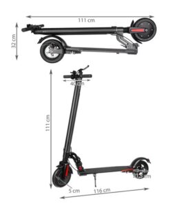 – мотор: 350 W; максимална скорост: 25 км/ч; обхват: 12-20 км; максимален наклон на терена: 15 градуса; максимално натоварване: 120 кг; батерия: 36 V 7.5 Ah литиева батерия; време за зареждане: 2-5 часа; E – Спирачка предна спирачна система + задна крачна спирачка; осветление: предно + задно и светлоотразители отстрани; Bluetooth връзка: да; Bluetooth обхват: 42m; специално приложение: да; брой скорости: 3 (които се задават в приложение 1, 2, 3); пълна амортизация; неплъзгаща се палуба; усукани дръжки; размери: 120/115/40 см.; размери след сгъване: 32/110 см; тегло на скутера: 14,40 кг; размери с опаковката: 16,45 кг.