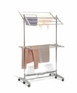 Електрически сгъваем сушилник за дрехи InnovaGoods. Този електрически сушилник за дрехи генерира естествен въздушен поток, за да ускори процеса на сушене, без да уврежда дрехите (ниска консумация на енергия, 24 W). 12-те пръта за сушене са подредени в четири сгъваеми крила, които могат да се регулират по височина и позиция, което позволява най-доброто използване на пространството. Издръжлива, вертикална и лесно преносима ел сушилня за дрехи с голям капацитет и издържащ до 20 кг дрехи. Има рамена с щипки за дребни дрехи и артикули с презрамки. Електрически, естествен въздушен поток: този сушилник за дрехи на колелца в стил кула генерира бриз (хладен въздух), който ускорява процеса на сушене на дрехите, сякаш дрехите се сушат на открито. Естественият въздушен поток не поврежда дрехите, за разлика от горещия въздух на сушилнята, който е по-суров. 12 бара, голям капацитет: нашият ефикасен, електрически вентилатор за дрехи от неръждаема стомана е издръжлив, лек, стабилен и безопасен. Модерна и иновативна сушилня за дрехи с голям капацитет и стабилна стабилност. Разполага с 12 лостове за окачване, подходящ е за всички видове облекла и издържа максимално тегло от 20 кг дрехи. Сгъваем, вертикален: този сгъваем въздушник за дрехи спестява място, когато се използва и когато се съхранява. Има 4 независими сгъваеми крила, които могат да се сгъват и разгъват поотделно, в зависимост от количеството дрехи, които се окачват. Краката също са сгъваеми за лесно съхранение в шкаф, зад врата и т.н. Многопозиционна, може да се разглобява: тази вертикална сушилня има 4 крила с регулируема позиция и височина. Раменете с щипки са много полезни за малки дрехи или за артикули с презрамки. Лесно се издига, като следвате инструкциите в приложеното ръководство и може да се използва на закрито и на открито. Преносим, с колелца: нашият удобен и практичен преносим сушилня за дрехи има 6 колела, за да улесни движението му във всяко пространство. Тази сушилня за дрехи с ниска консумация на енергия с мощност от 24 W позволява пестене на енергия, тъй като консумира много по-малко енергия от барабанна сушилня. Тази вертикална сушилня е издръжлива, поддържа до 20 кг дрехи и предлага стабилност чрез своята изработка от неръждаема стомана. Сгъваемият дизайн позволява лесно съхранение, а с 6 колелца се улеснява пренасянето всякъде. Вентилаторът предоставя естествен въздушен поток, който не уврежда дрехите, като предлага алтернатива на сушилнята. Неговите множество позиции и специалните рамена за дребни дрехи и артикули с презрамки го правят изключително функционален. Разгледайте още продукти в категорията “Сушилници за дрехи” – ТУК!