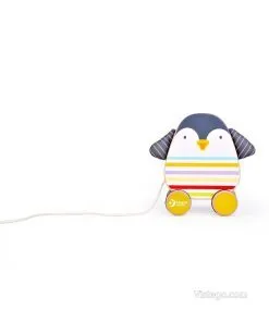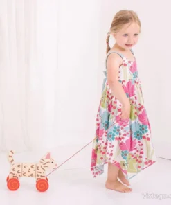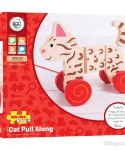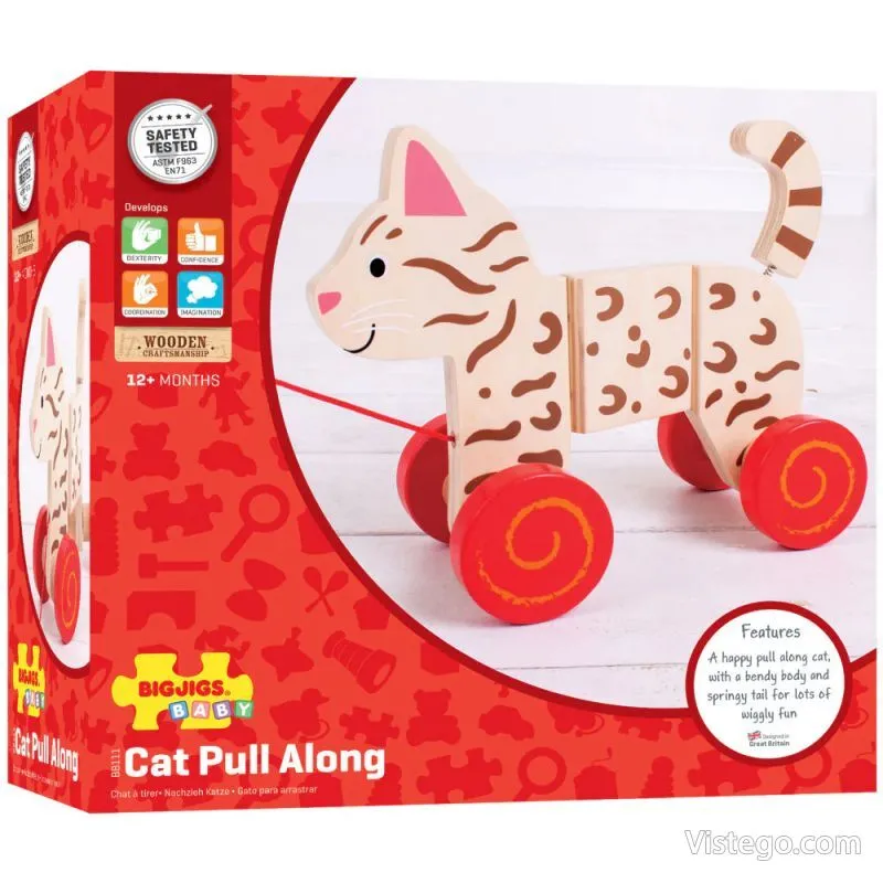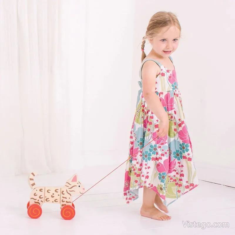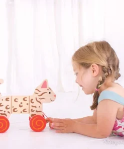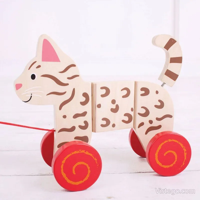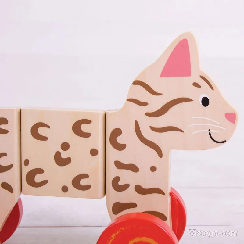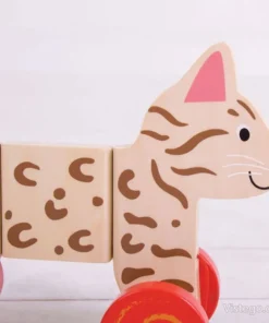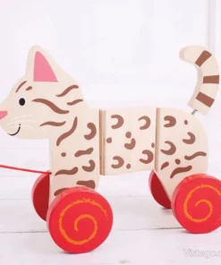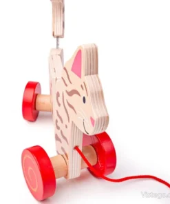 Играчка за дърпане „Коте“ от дърво с гладко търкалящи се колела и пружинираща опашка. Подходяща за активна игра и координация.